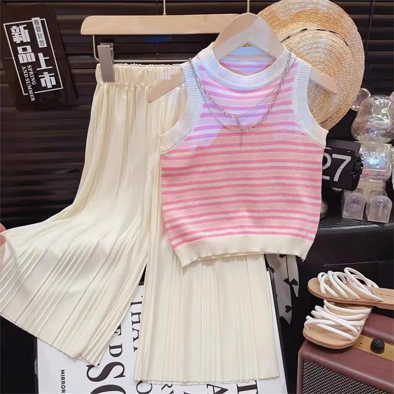 2026 Girls Clothing Sets Sweet Striped Sleeveless Knit Vest With White Loose Pants
