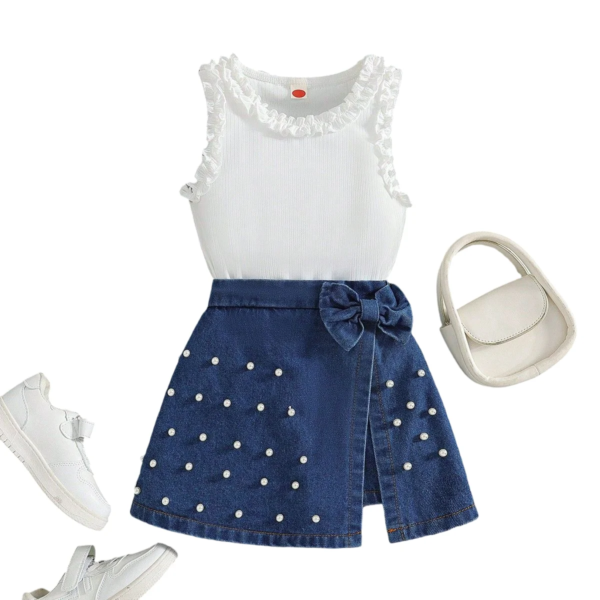 Children's Clothing for Girls Aged 4-7 Sleeveless Fashion Short Top Paired with Casual and Cute Polyester Cotton Denim Pants