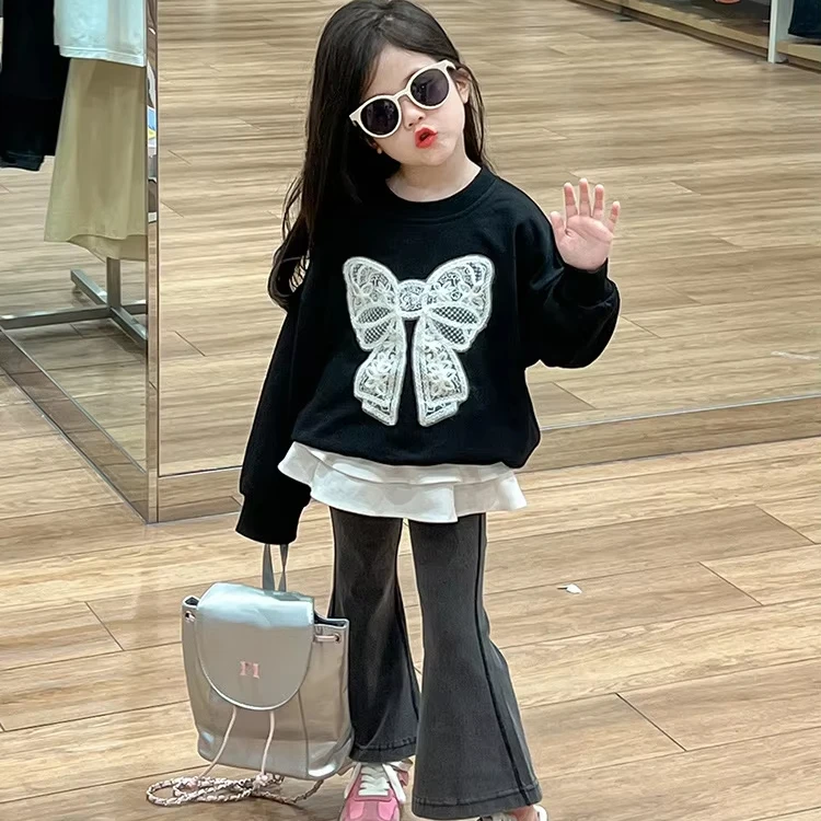 Autumn New Style Lace Bow Hoodie Stacked Cake Skirt Western Retro Bell Bottom Pants Set