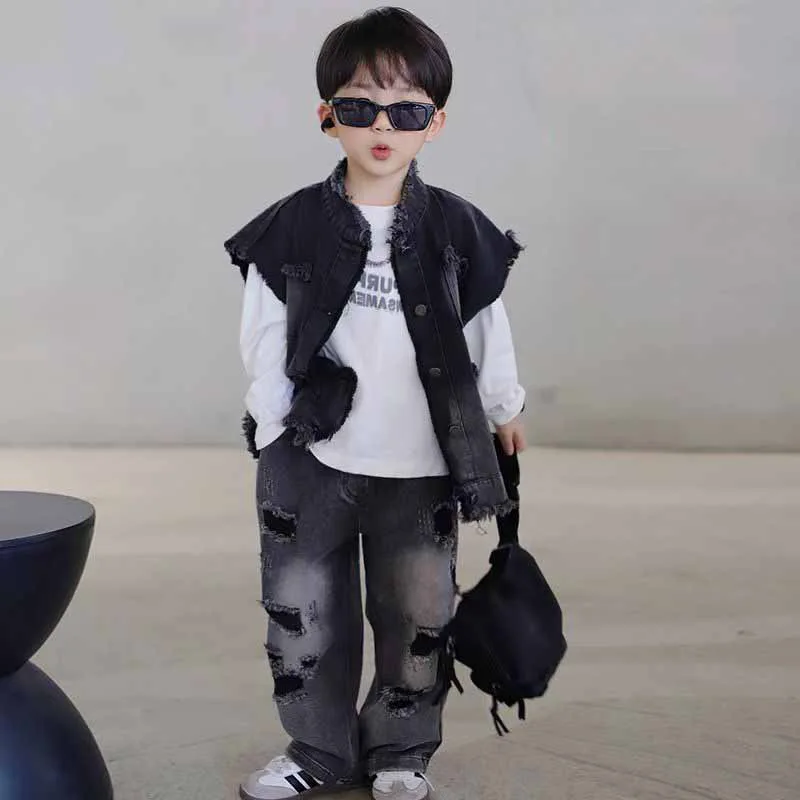 Boy's Ripped Denim Vest Pantsuit Spring Children's Jacket Pants Jacket