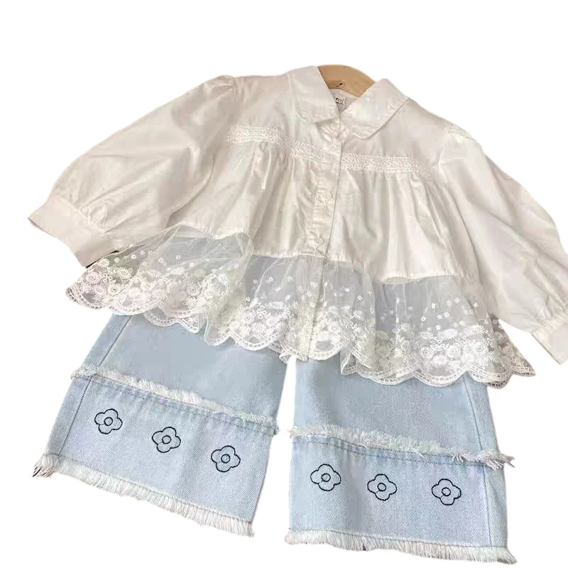 2026 New Girls' Spring Outfits Korean Style Lace Blouse & Denim Pants Two-Piece Set Chic Children's Clothing for Kids