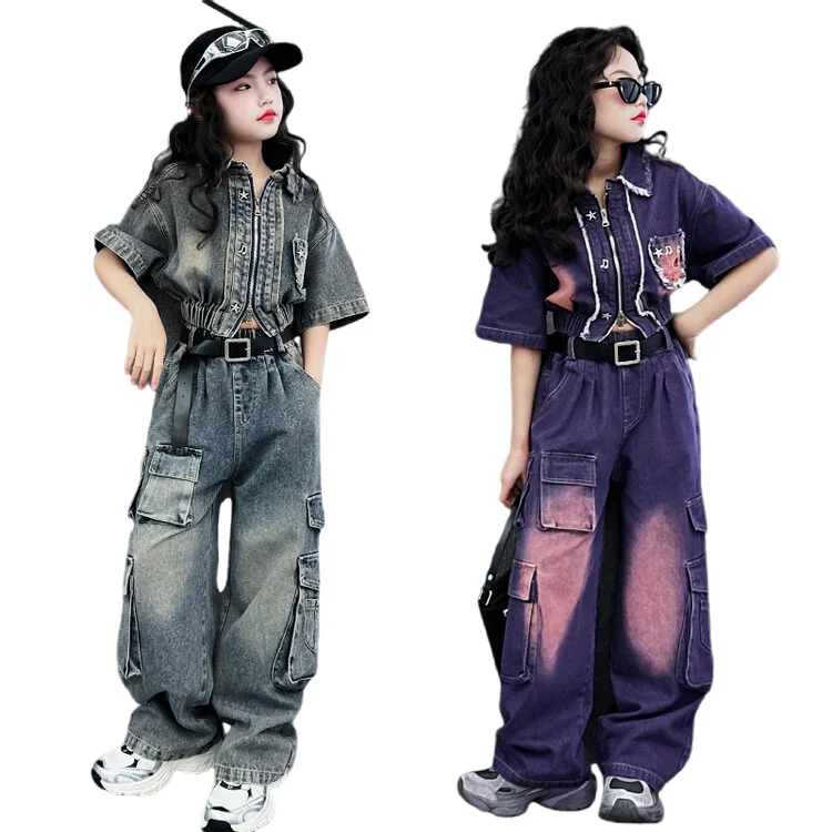 2026 New Teenager Girls Cargo Tie Dyed Denim Shirt + Cargo Pants Purple Blue 5-15 Years Girl's Clothing