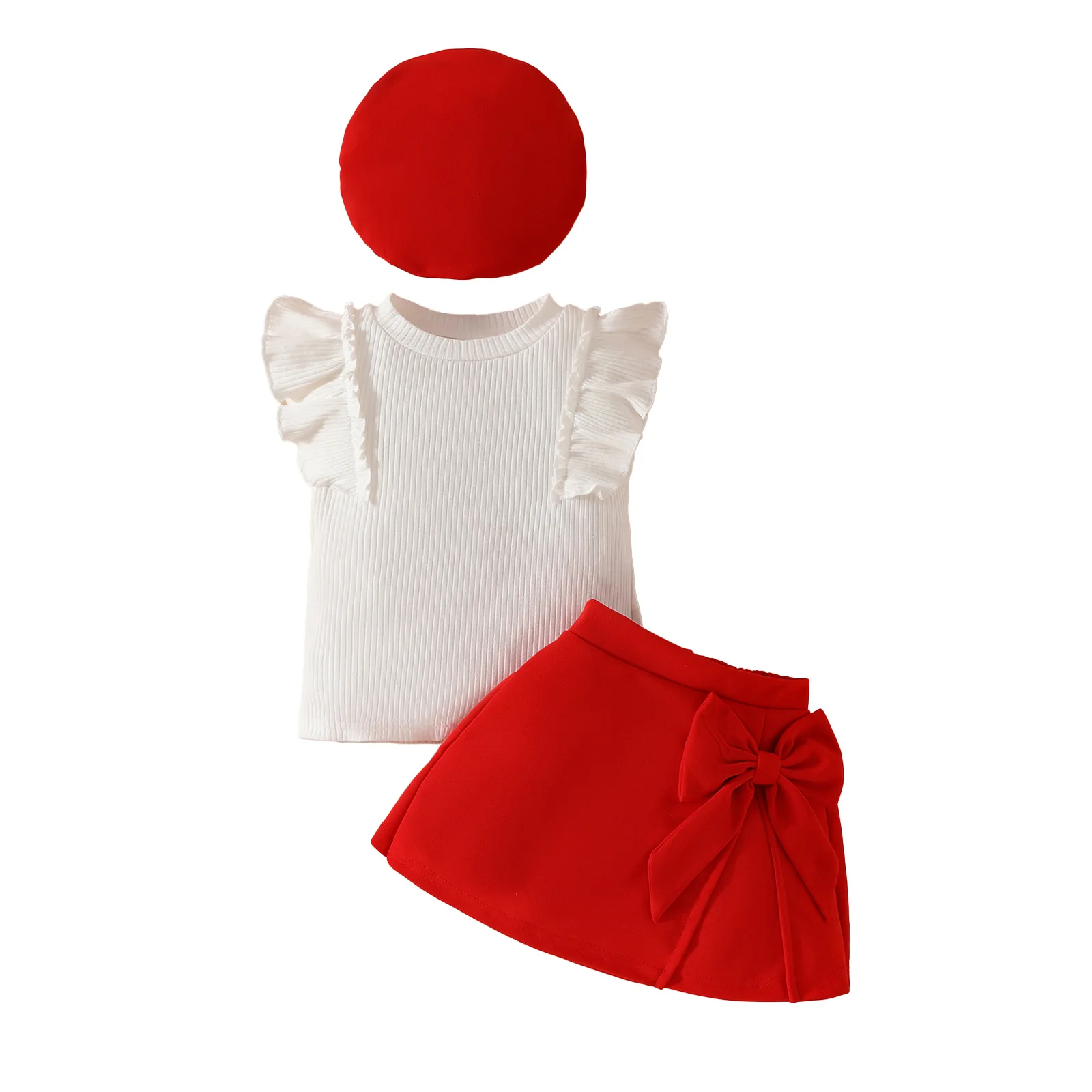 2026 Autumn New Girls Casual Set Solid Color Fly Sleeve Jacket with Pleated Skirt Belt Hat Cross-Border