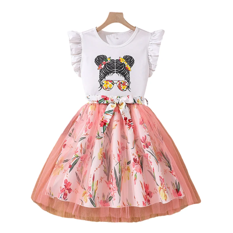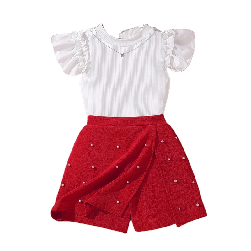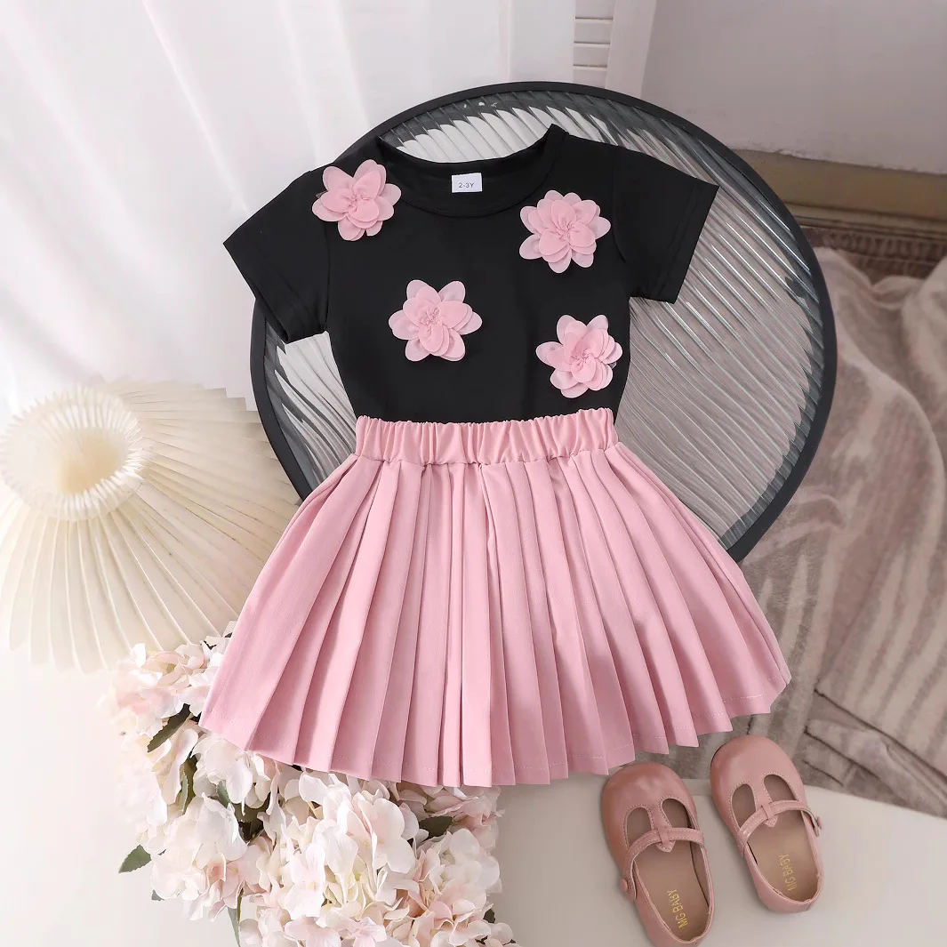 2026 Summer New Girls Casual Set Short Sleeve T-shirt With Flower Patch Print + Princess Pleated Skirt