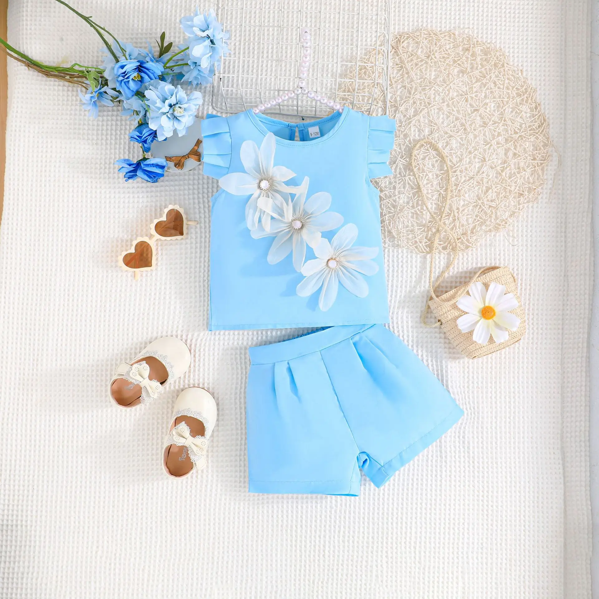 2026 New Blue Color Baby Clothes Set Girl Sleeveless Shirt Ruffle Skirt Two Piece Clothing Set