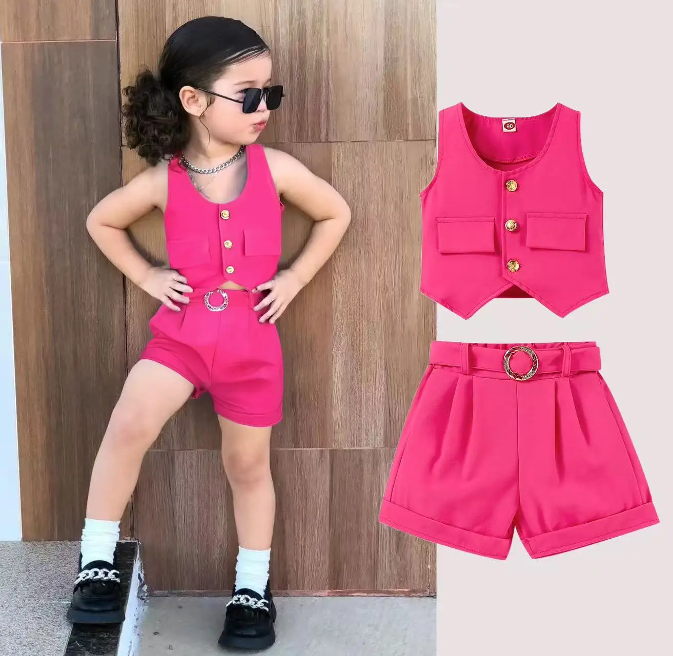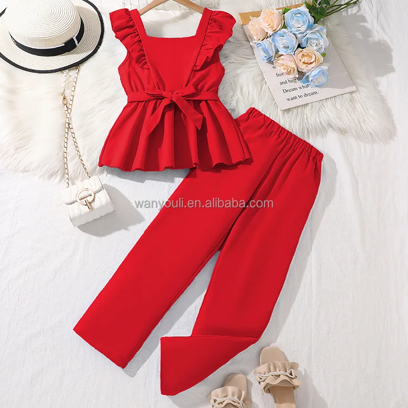 2026 Summer New Temperament Girls' Two-Piece Set Solid Cross-Border Children's Clothing Includes Suspender Jacket Wholesale