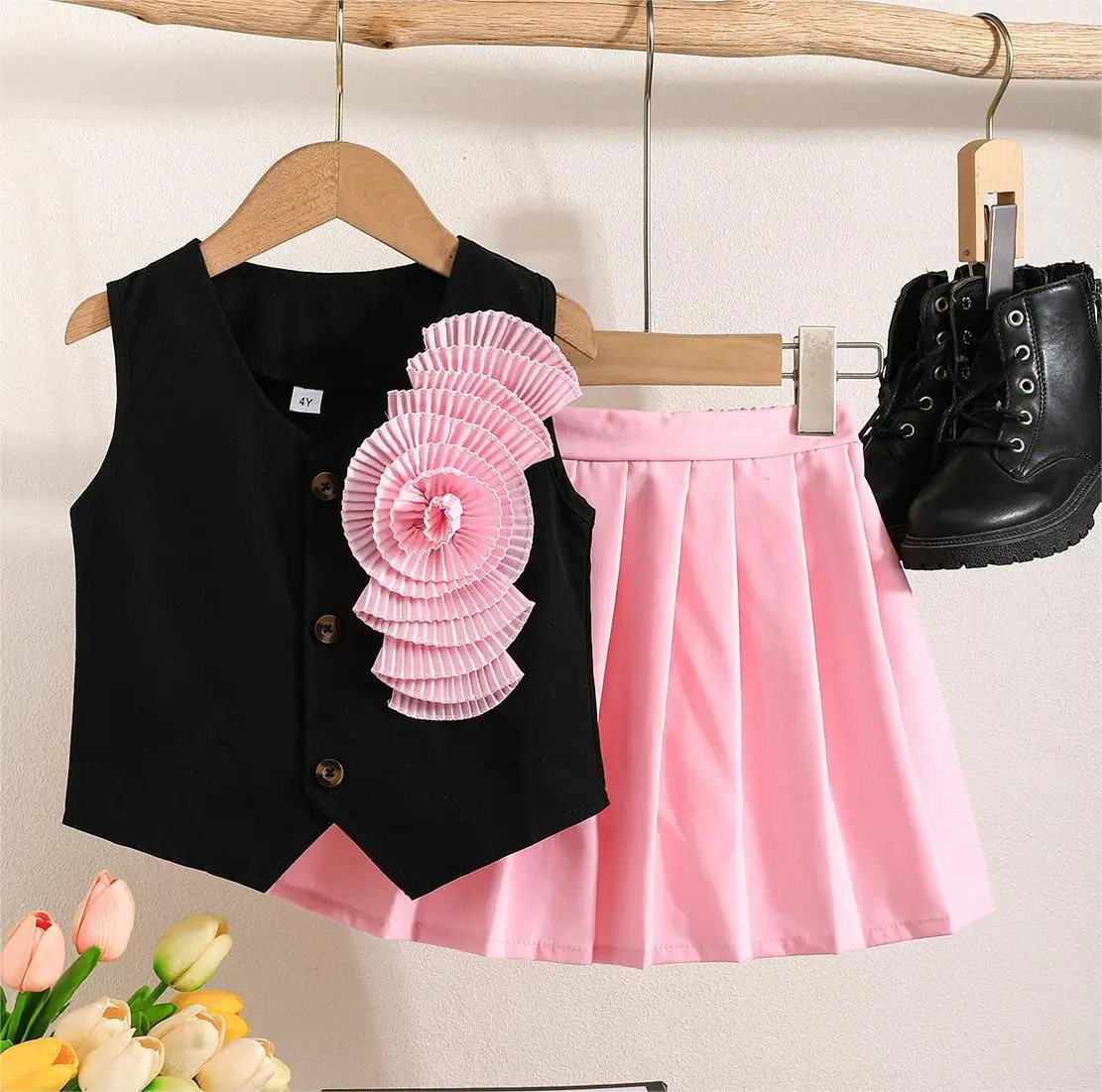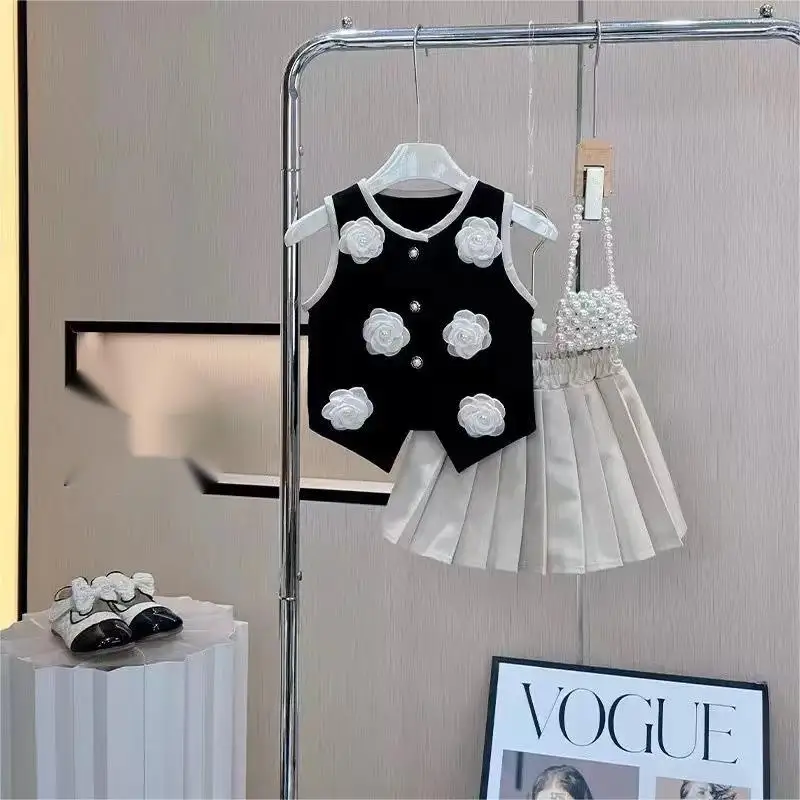 Girls' Summer Casual Academic Style Top Pleated Skirt Set Black Sleeveless Satin Floral Pink Korean Western Inspired Cotton