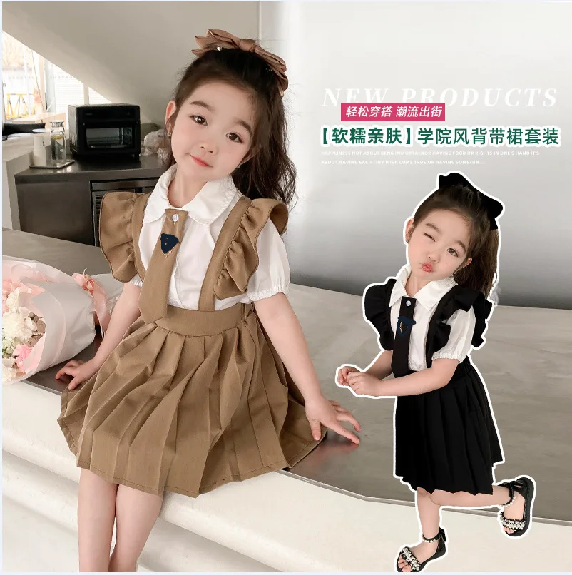 Korean Summer Girl Clothes Set Kids Summer T Shirt Suspender Dress Two Piece Clothing Sets Casual Girl Suit
