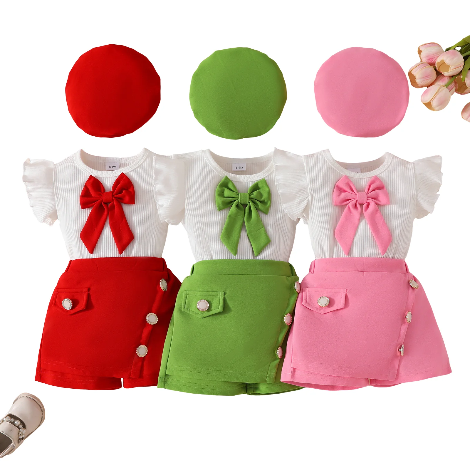 Latest Summer Toddler Girl Clothes Sets Sleeveless Ruffled Large Bow Top Short Culottes 3Pcs Suit Baby Clothes