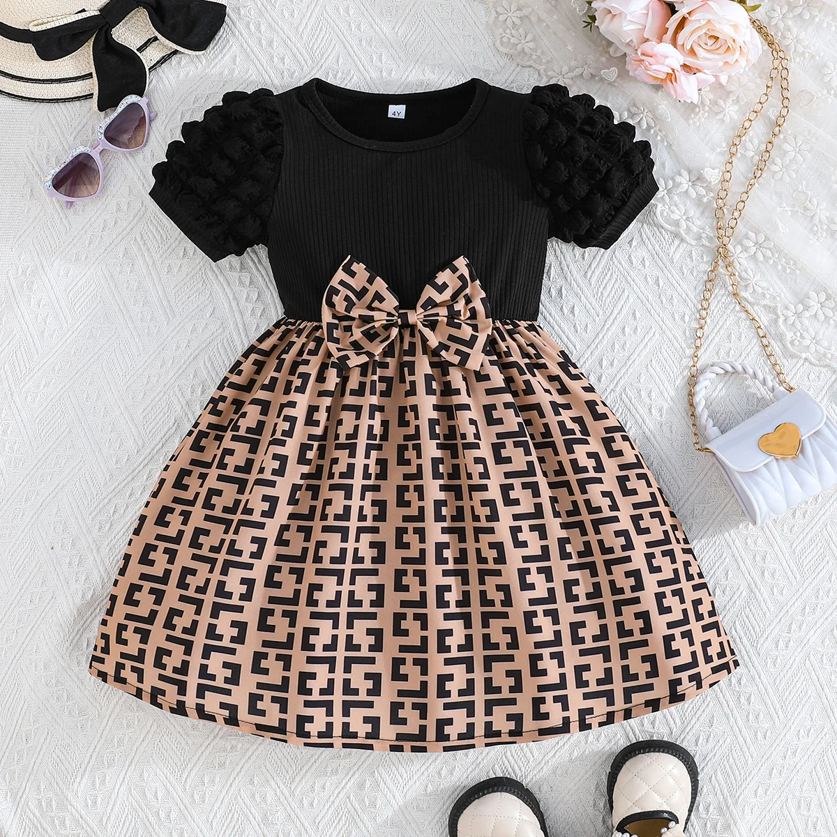 Exquisite Elegant Girls Dress for Ages 2-8 Fashionable Summer Clothing With Puffy Sleeves and Bow Party Kids Clothing