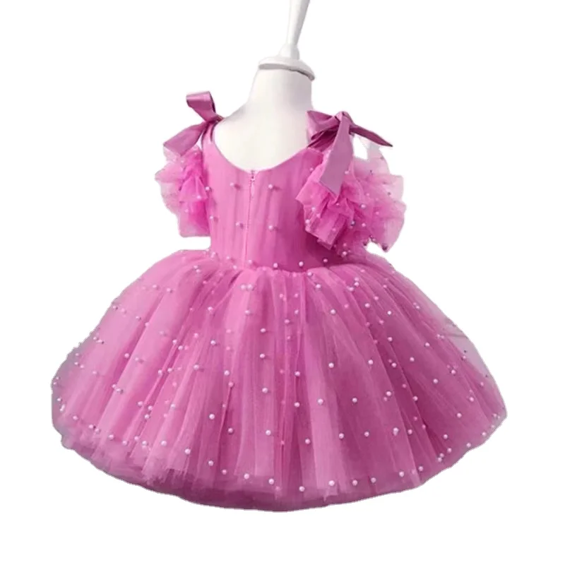 Pink Birthday Princess Dress Toddler Festival Clothing Heavy Industry Children's Bead Decoration Shoulder Strap Dress