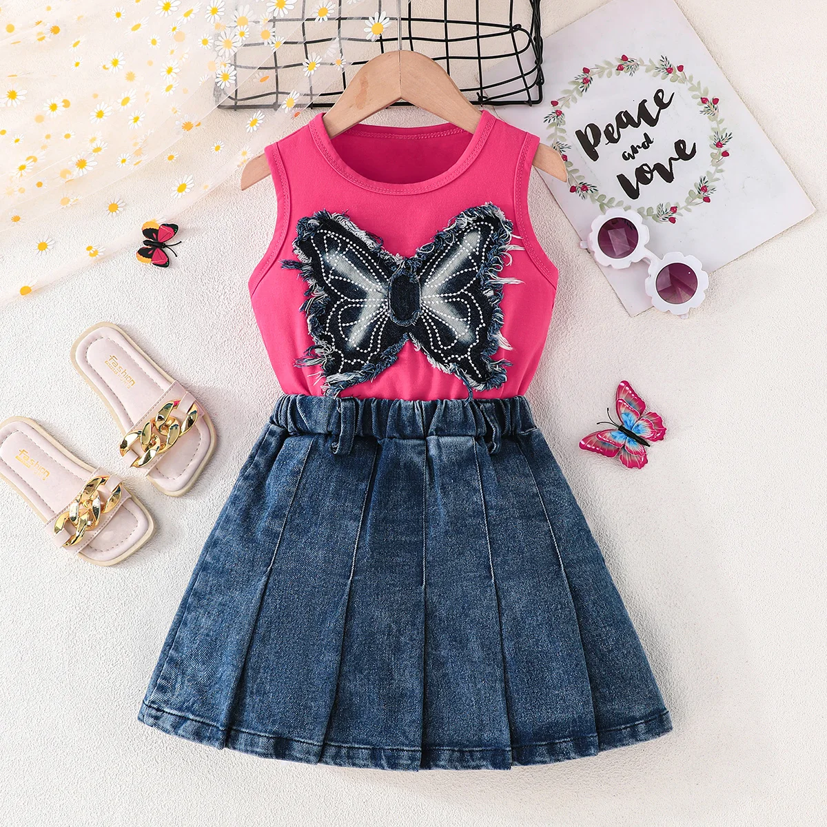 Children's Clothing for Girls Aged 4-7 Fashion Butterfly Pattern Top Paired with Polyester Cotton Denim Pleated Skirt Factory
