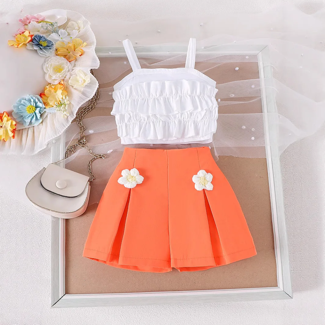 Girl Clothes Multi-Layered Wavy Lace 3D Flower Short Two-Piece Kids Clothing Girls Cute Children's Clothing