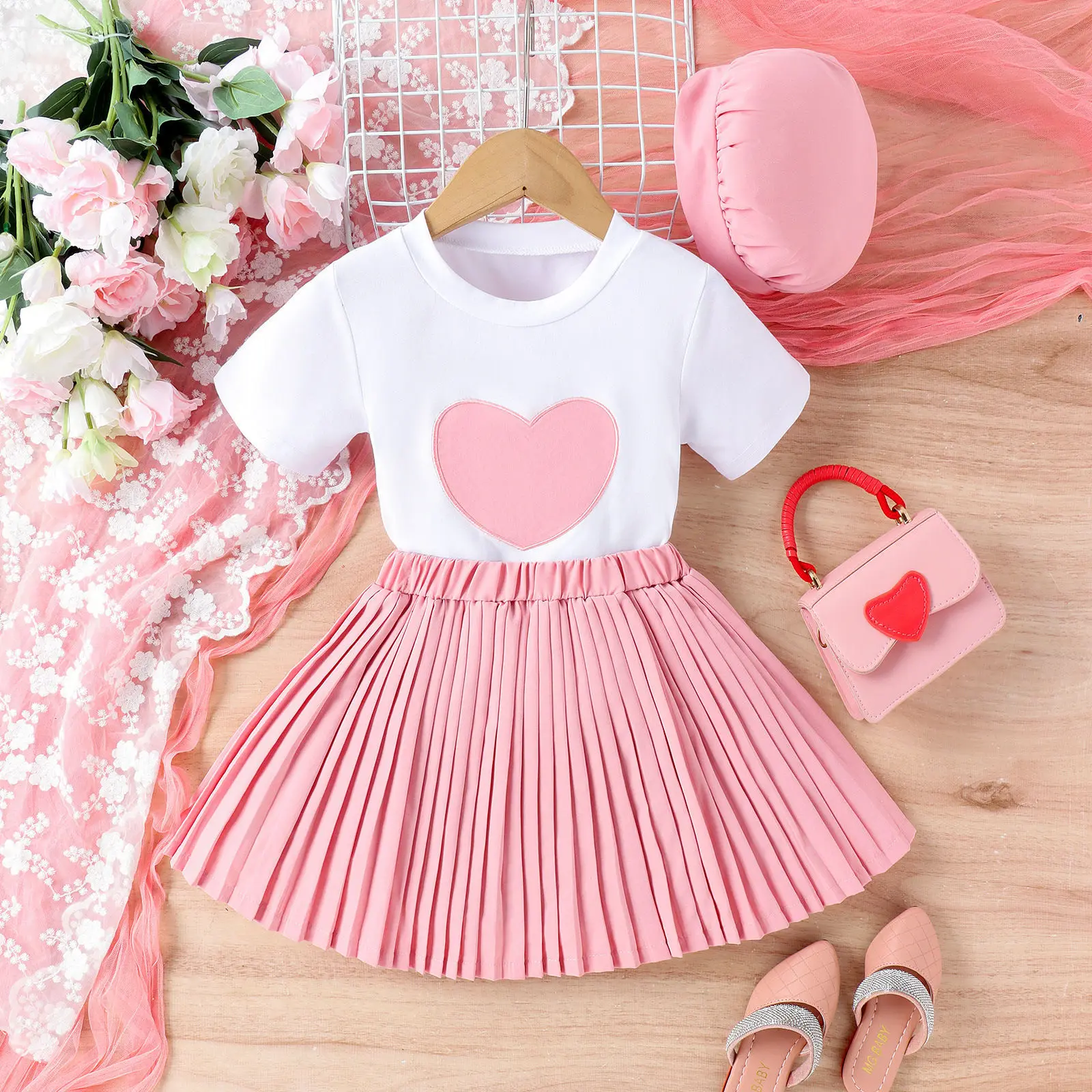 Summer New White Stitching Love Short Sleeve Solid Color Pleated Skirt Hat Girl Three-Piece Casual Suit Breathable Use Clothes