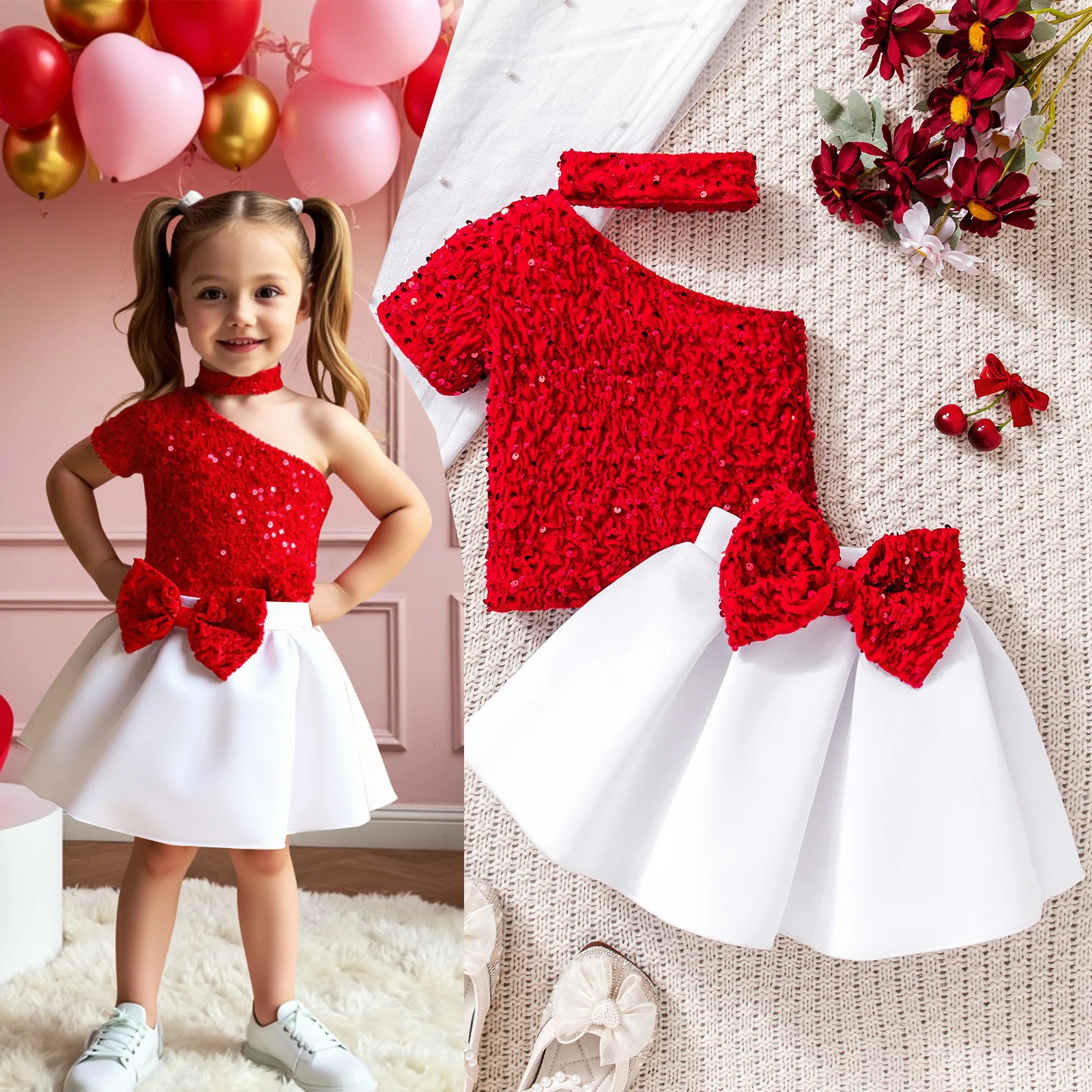 Summer Cute Girl Casual Suit Baby Child Hanging Neck Shoulder Sequin Short Sleeve Unkempt Cotton Skirt