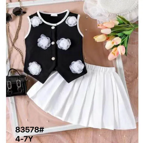 4-7T Kids Clothing Elegant Luxury 3D Flowers Sleeveless Cardigan Jacket Pleated Skirt 2Pc Girls Clothes Summer Kids Clothes 2026