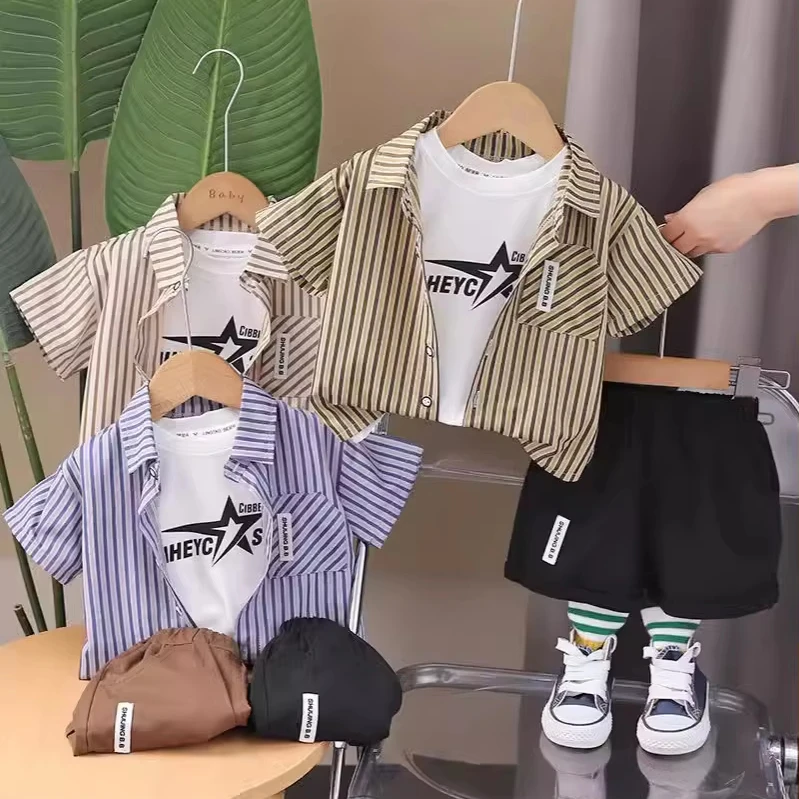 2026 New Boys Summer Clothes Children's Cotton Short Sleeve Shirt Set Striped Suit