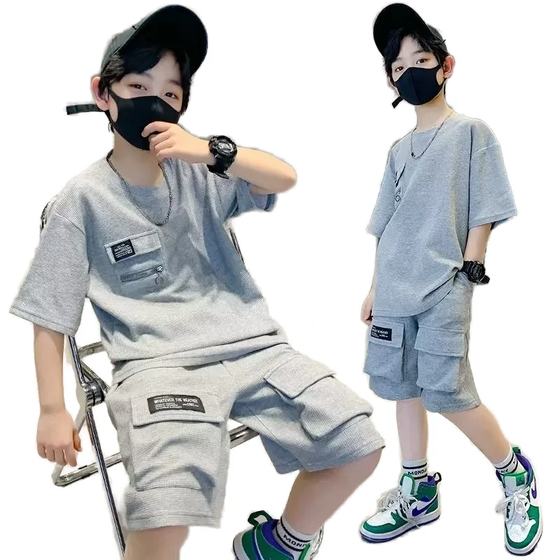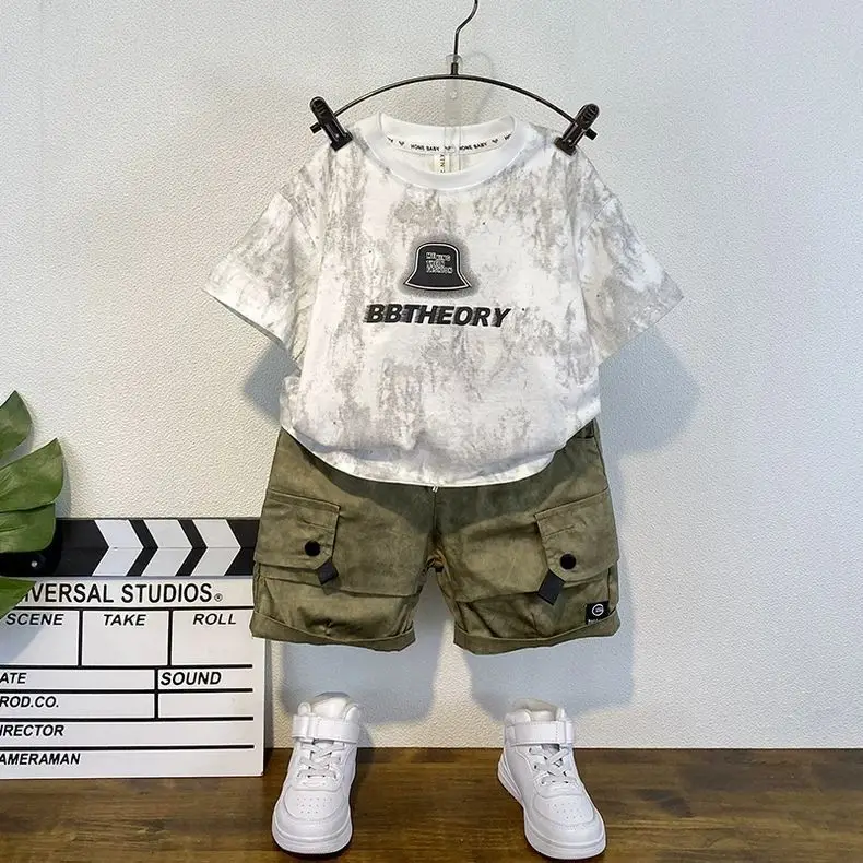 2026 New Boys Casual Cotton Short Sleeve Suit Fashionable Foreign Style Two-Piece Set for Small Boys in Summer
