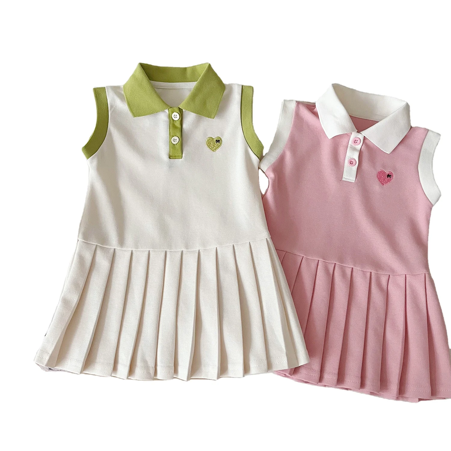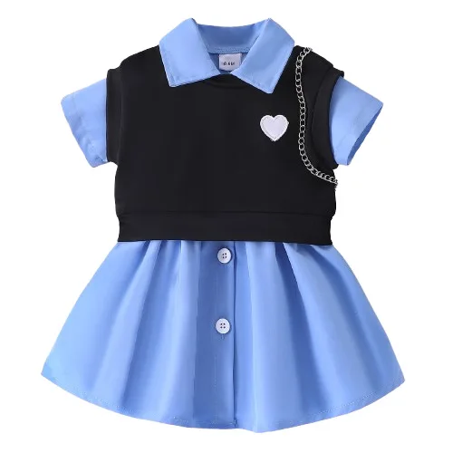 2026 Summer Wholesale 1 Year Old Kids Clothing Short Sleeve Solid Color Shirt Dress Love Heart Vest 2Pcs Girl Baby Clothes