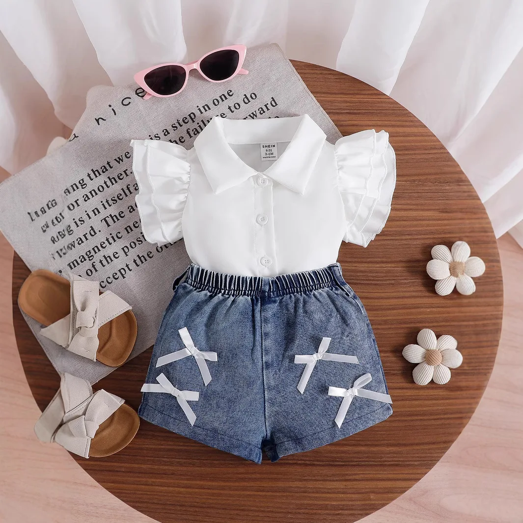 2026 New Summer Style Children's Clothing Wholesale Girls Flying Sleeve Thin T-shirt Shorts Suit Made Cotton Autumn/winter Wear