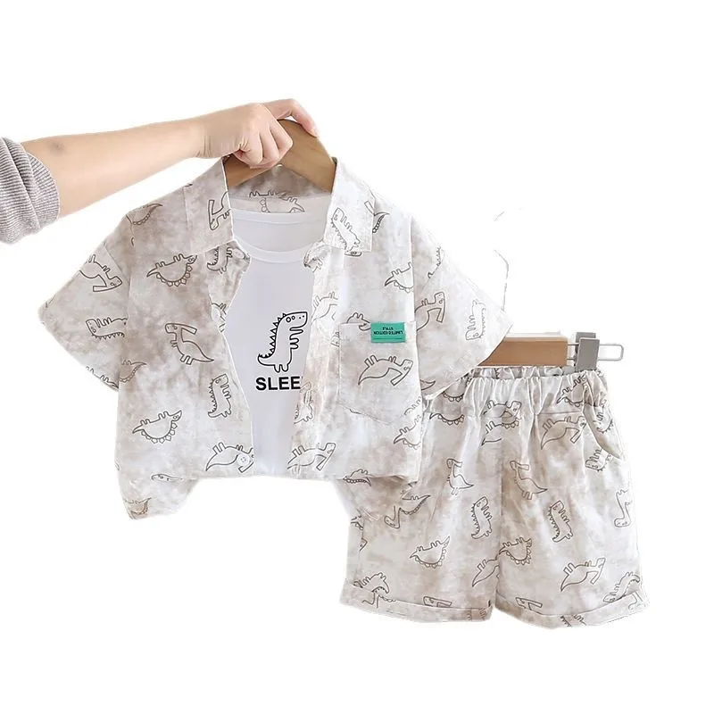 2026 Summer Children's Three-Piece Set Boys' Casual Print Dinosaur Short-Sleeved Suit Fashionable Cartoon Clothes