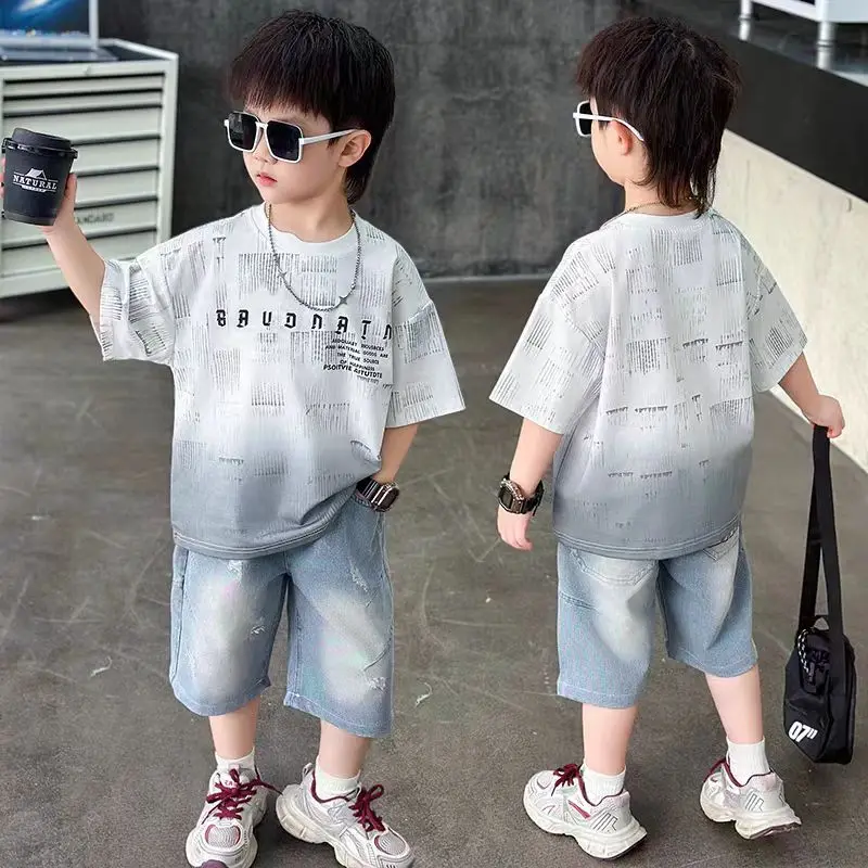 2026 Boy's Clothes Set for Summer Letter Print Shirt Patched Denim Shorts 2 Pcs Sets