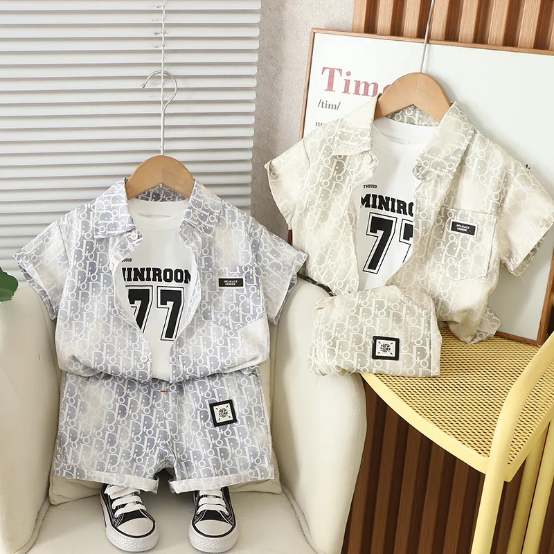 2026 New Summer Children's Short-sleeved Suit for Boys Fashionable Casual DO Round Neck Top Shorts Three-piece Set