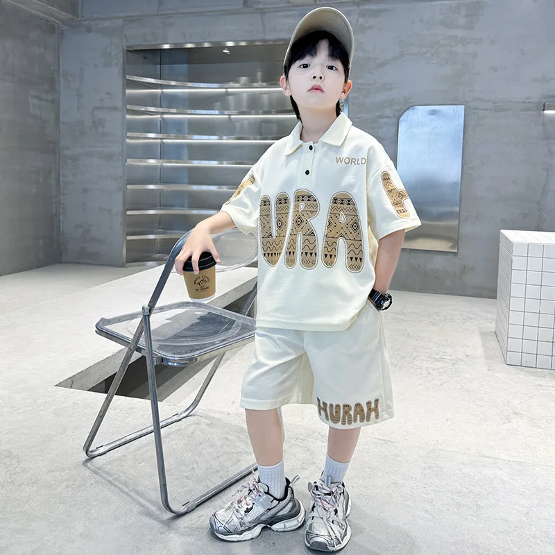 2026 New Boys Summer Two-Piece Casual Suit Cotton Short Sleeve Polo Shirt and Shorts With Printed Pattern for Children