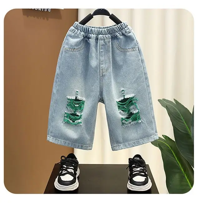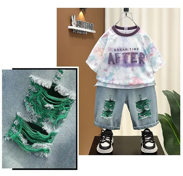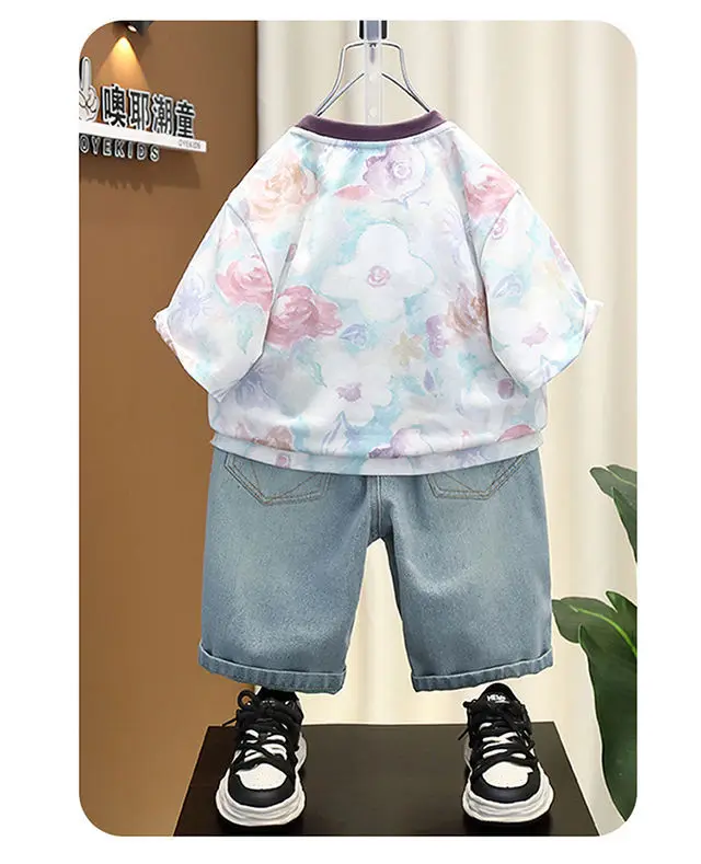 2026 Boy’s Clothes Set for Summer Letter Print Shirt Patched Denim Shorts 2 Pcs Sets
