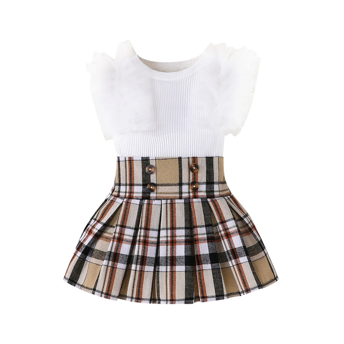 2026 European American Cross-Border Casual Style Sweet Princess Mesh Top With Short Sleeve Solid Pattern Plaid Pleated Skirt Set