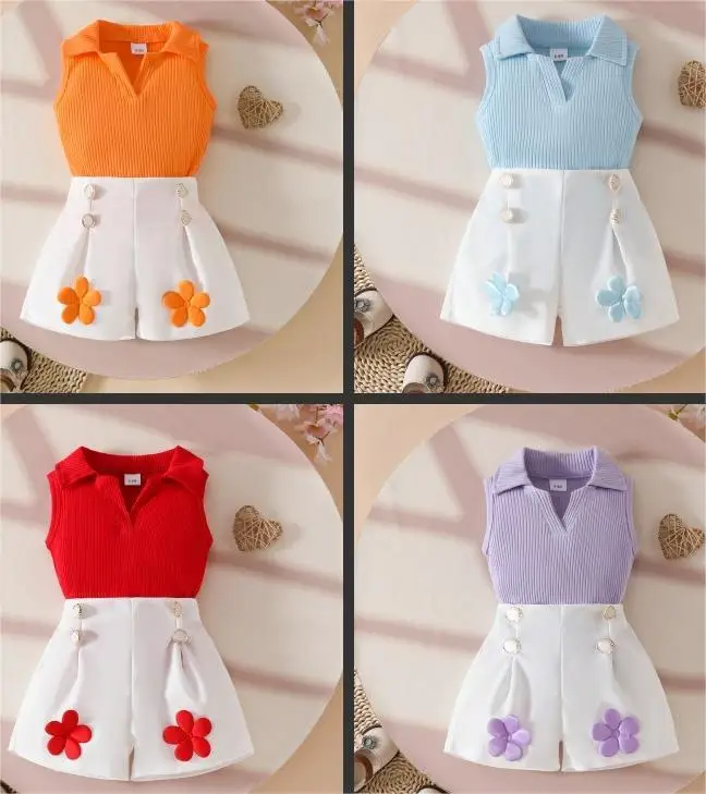 2026 European and American Girls Casual Set V-Neck Sleeveless Pit Top With White Applique Shorts Lapel Pants Style