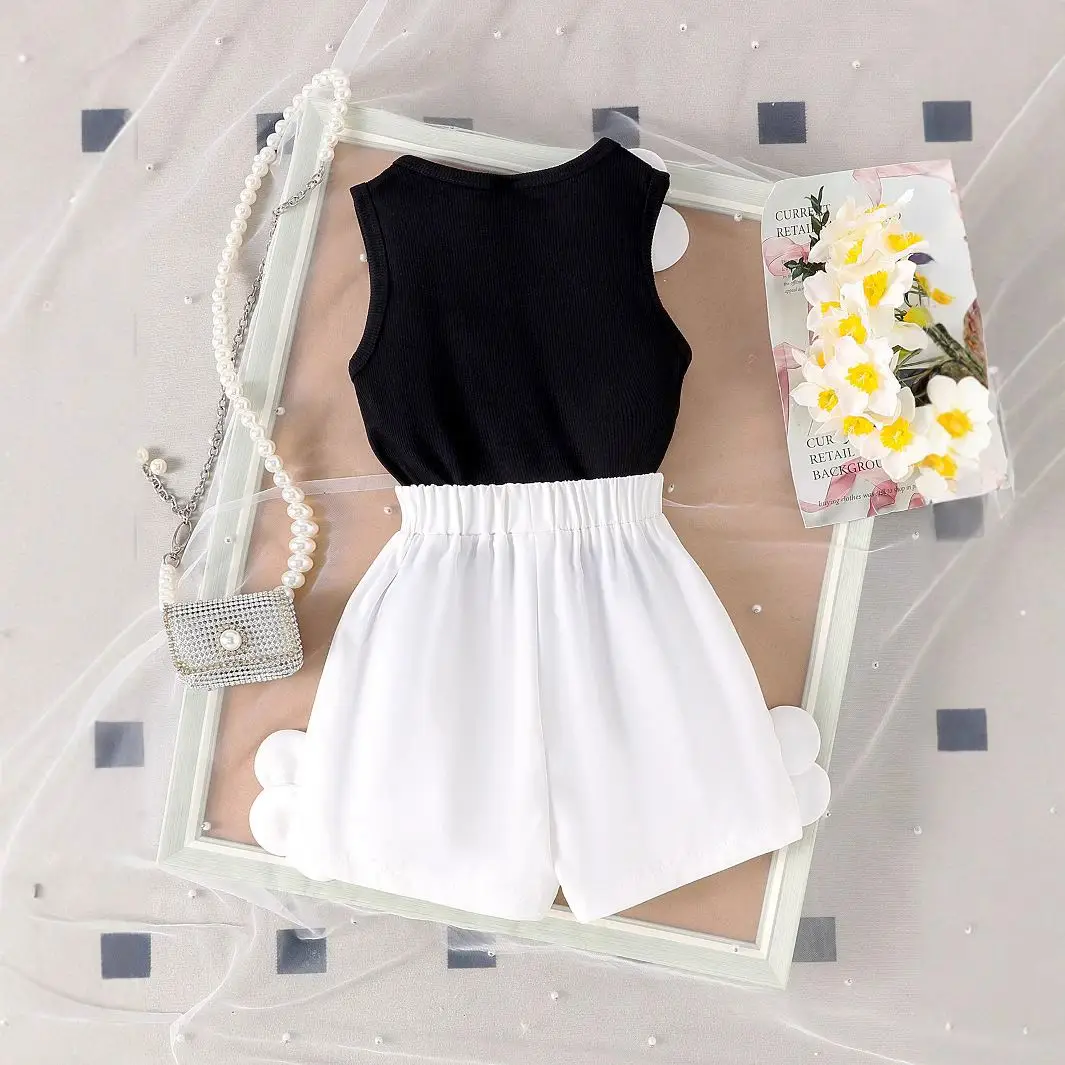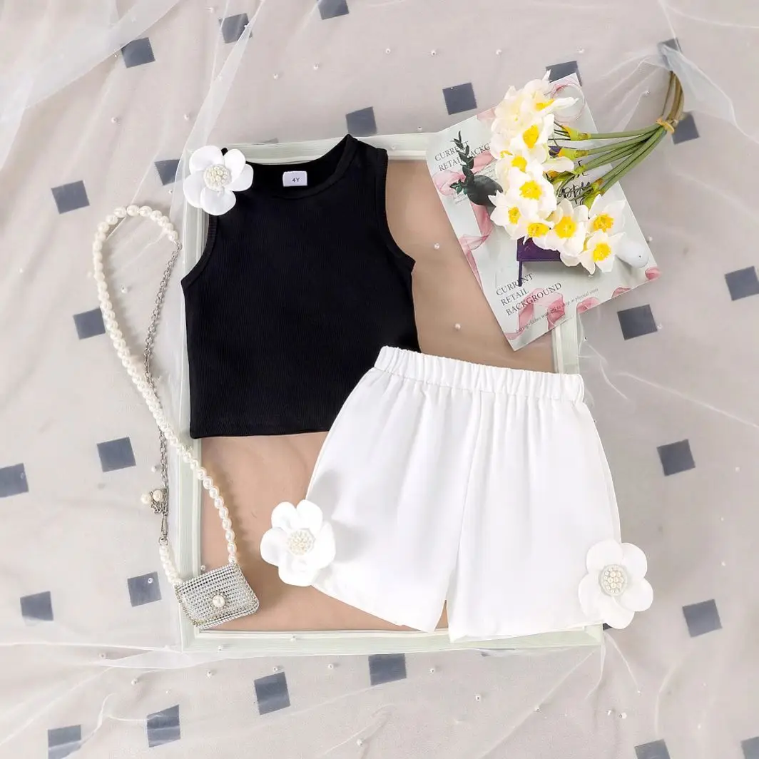 2026 New Arrivals Kids Clothes Sets Wholesale Fashion Halter 3D Flower Vest Solid Color Shorts 2Pcs Summer Girls Clothing