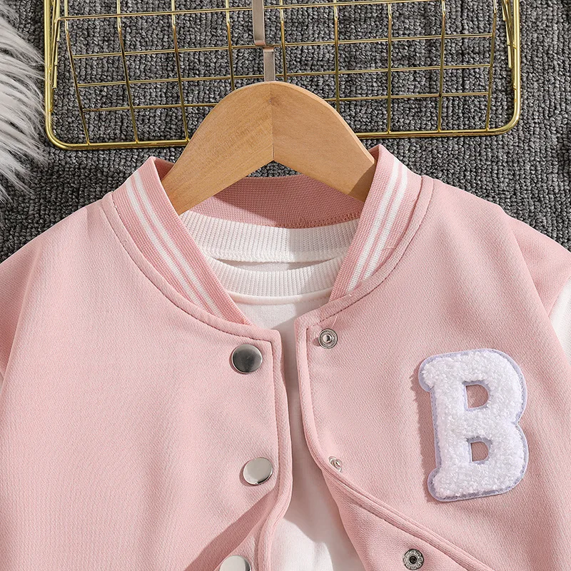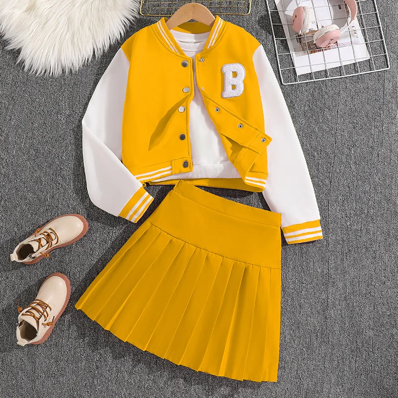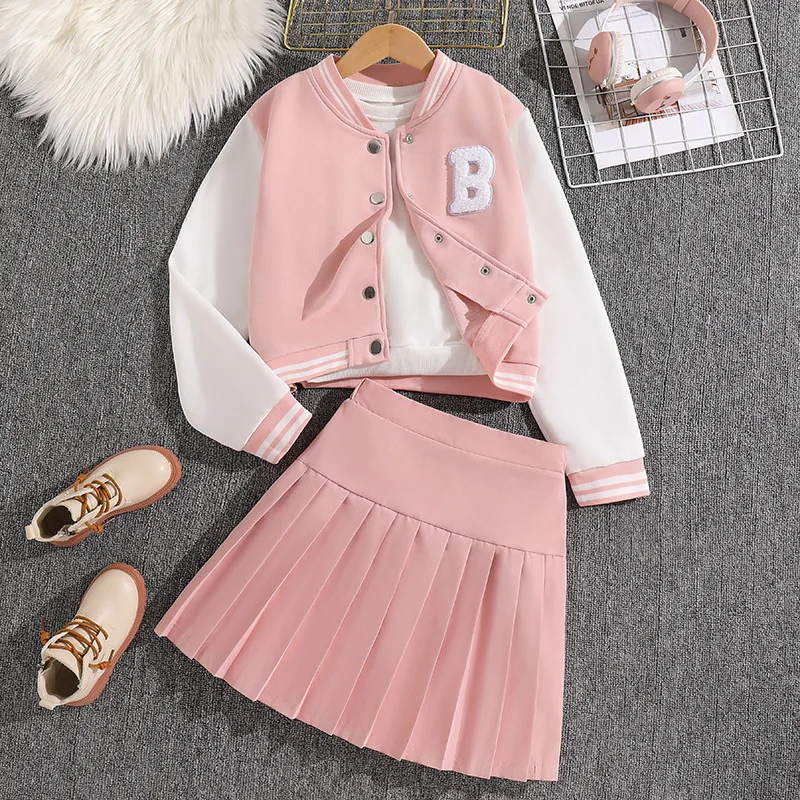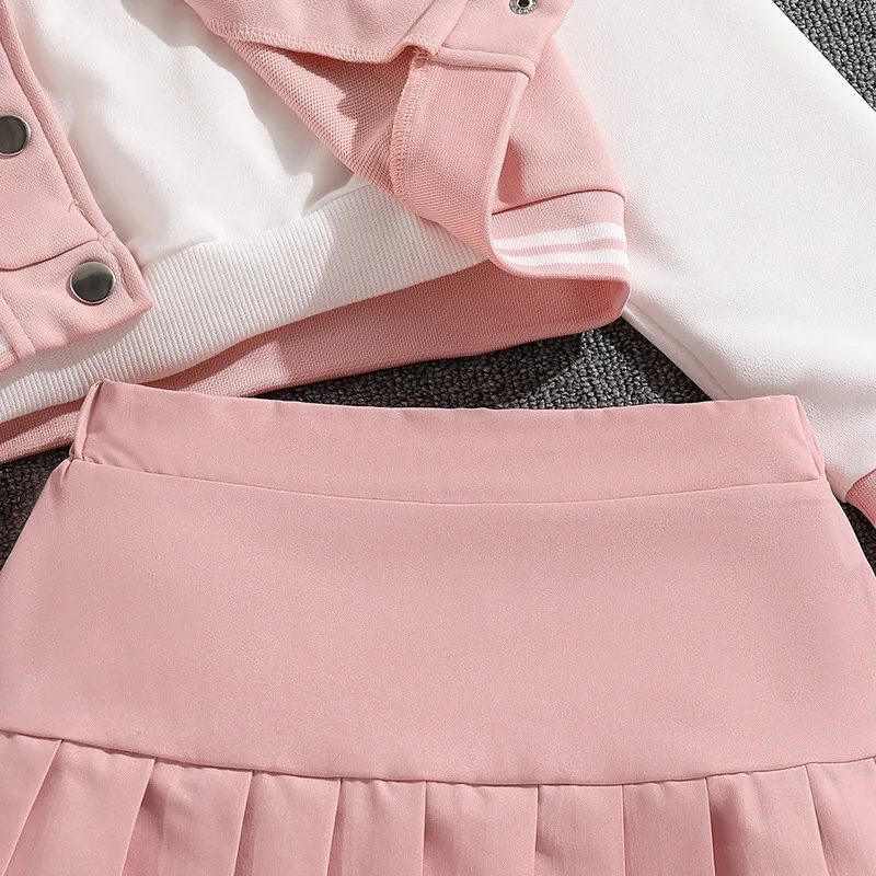 2026 New Korean Girls’ Preppy Two-Piece Outfit Sports Suit Baseball Jacket Pleated Skirt for Spring Autumn Hip Hop Solid Cute