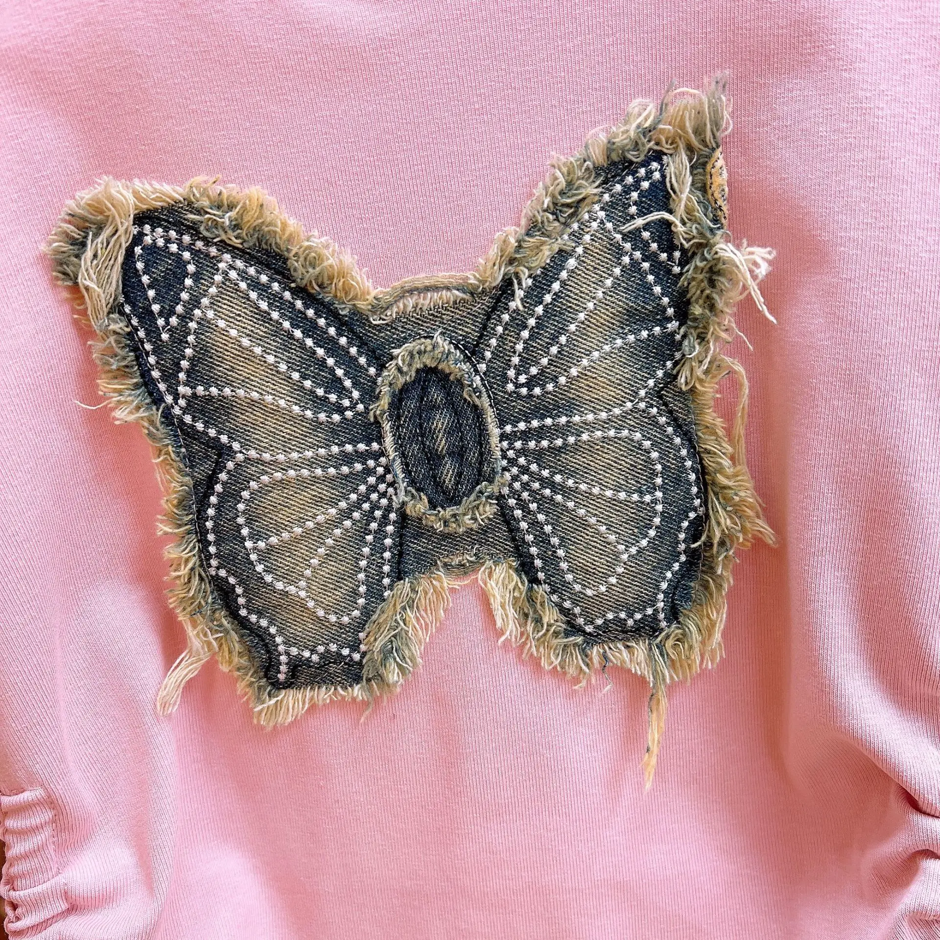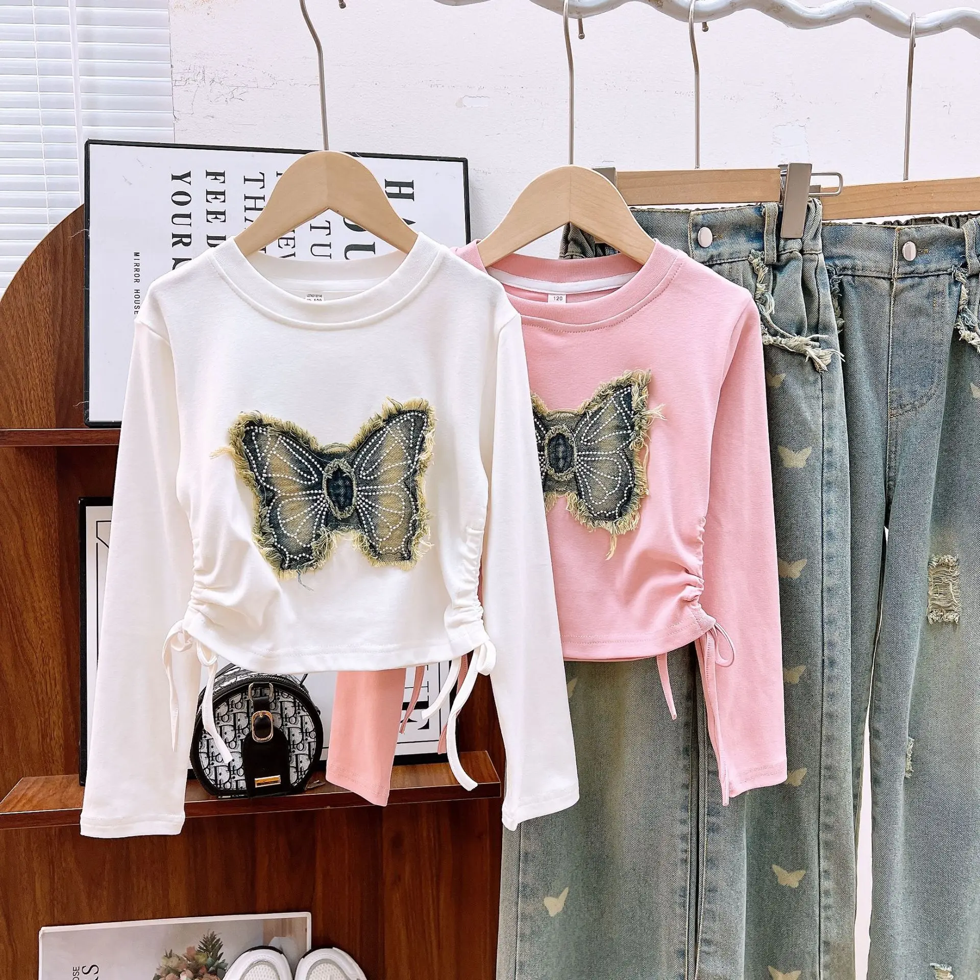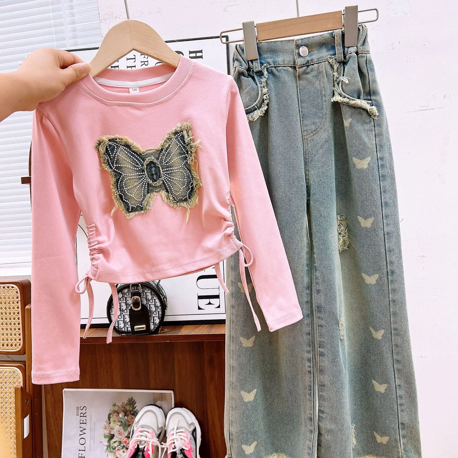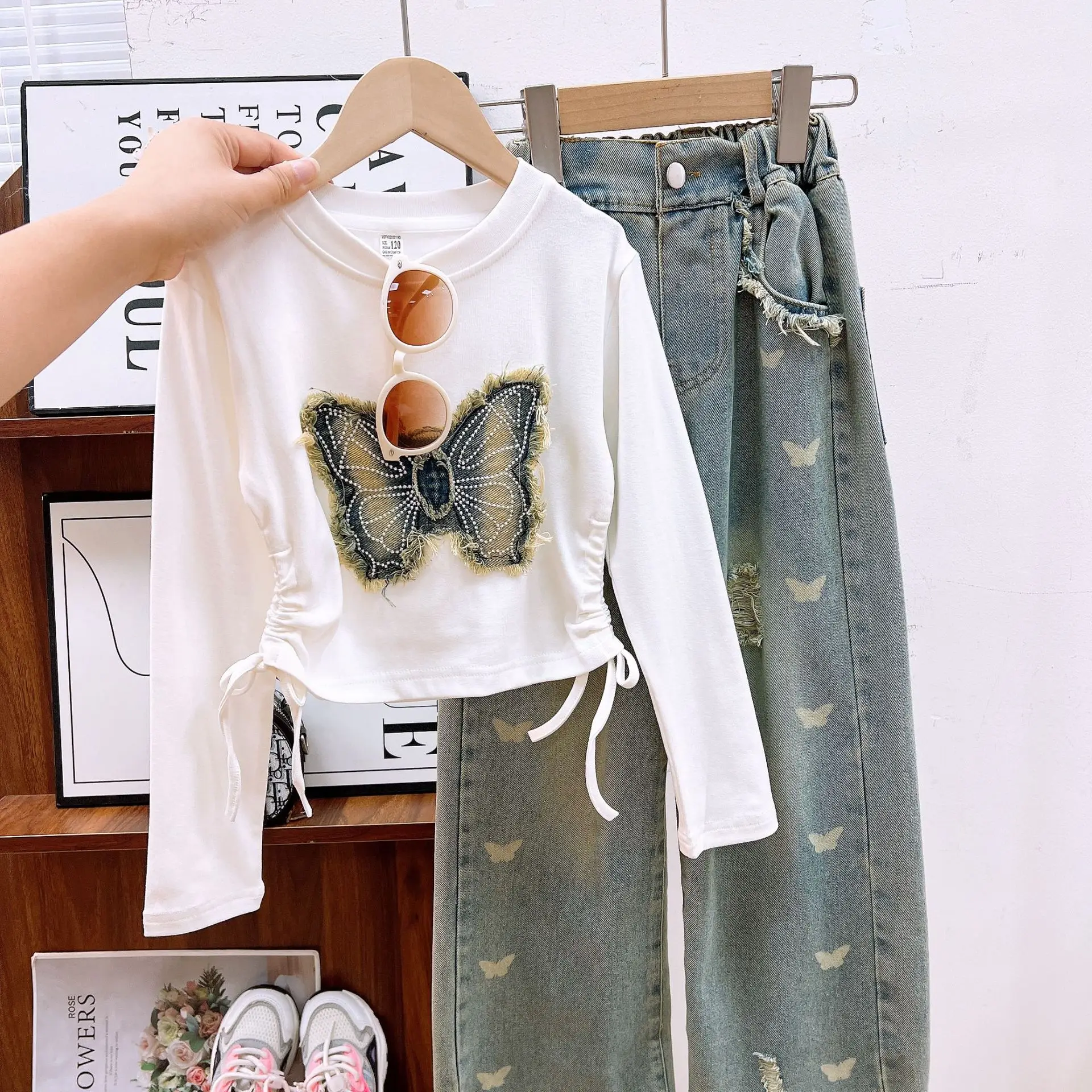 2026 New Spring Girls’ Fashion Outfit Set Butterfly Embroidery Blouse & Denim Pants Two-Piece Korean Style Clothing for Teen