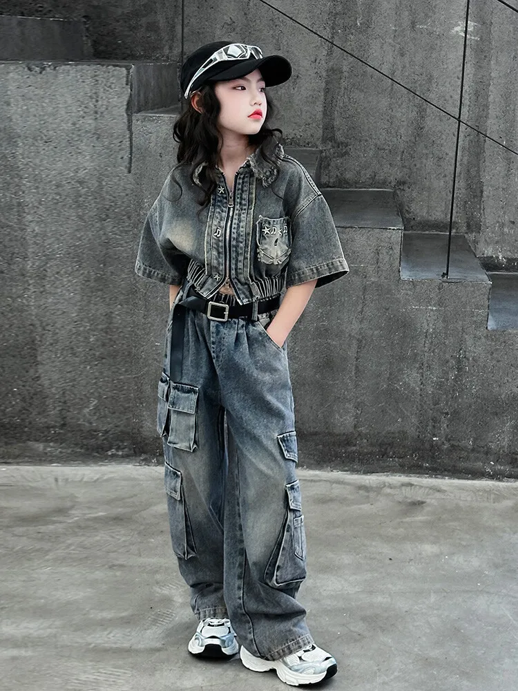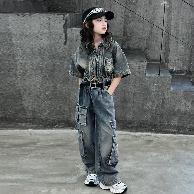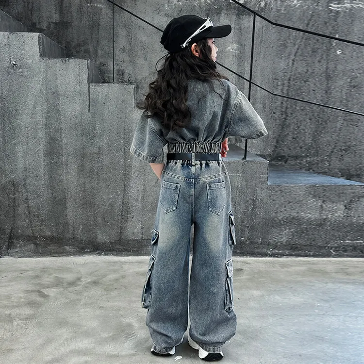 2026 New Teenager Girls Cargo Tie Dyed Denim Shirt + Cargo Pants Purple Blue 5-15 Years Girl’s Clothing