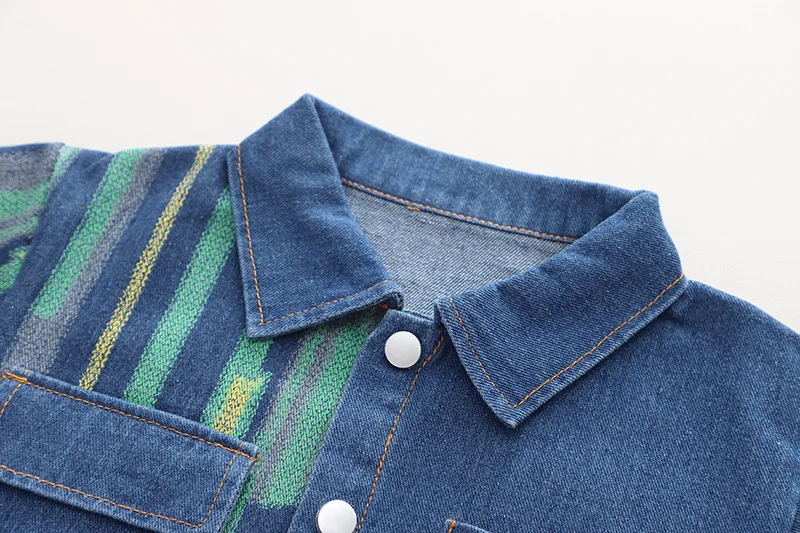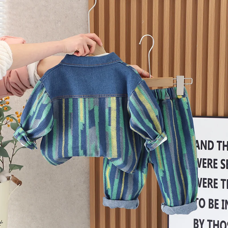 2026 Spring Autumn Boys’ Casual Print Three-Piece Set Handsome Vertical Denim Suit with Long Sleeves Foreign Style for Children