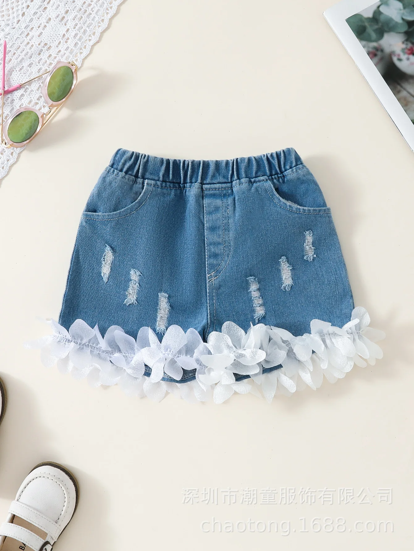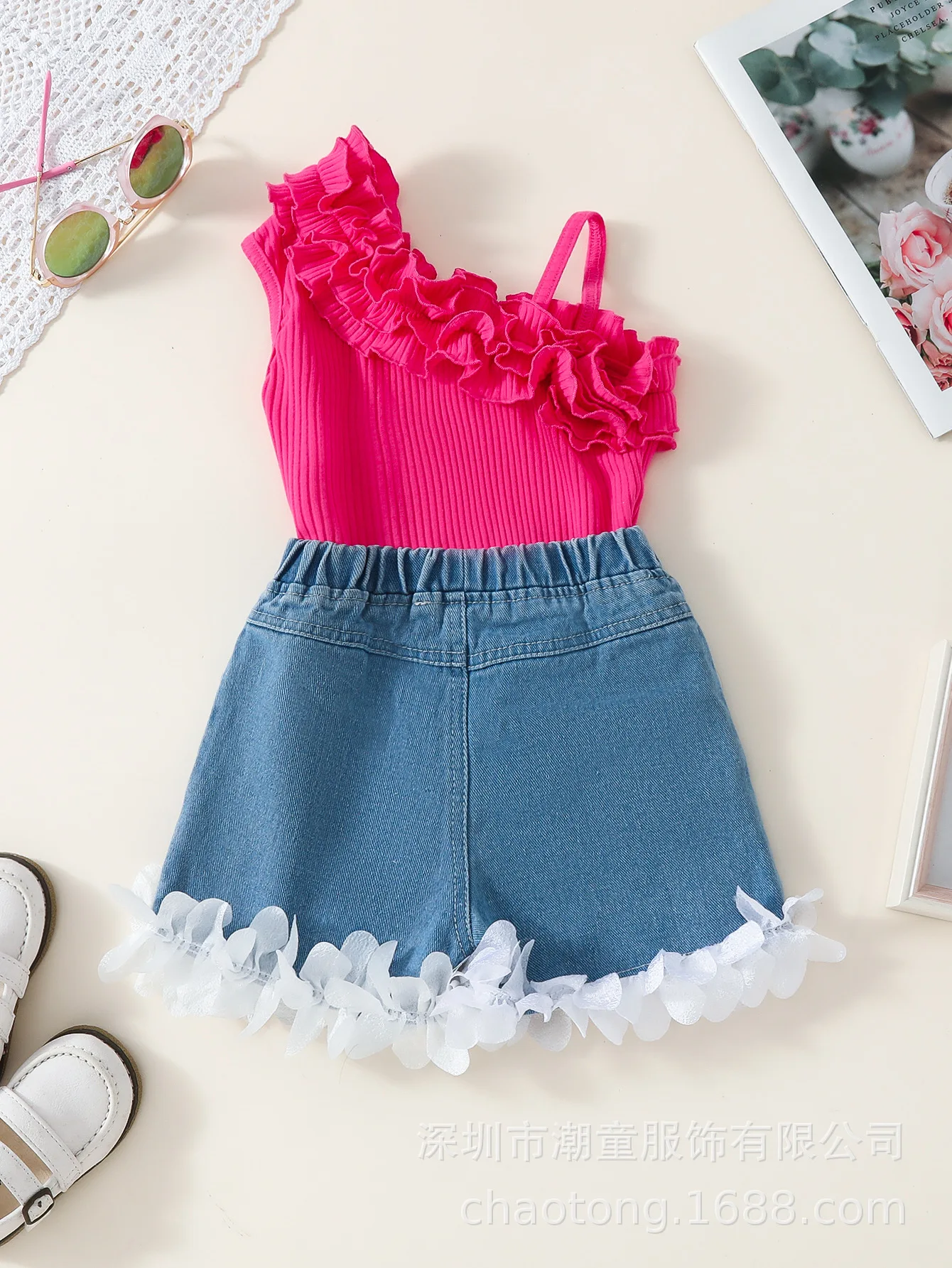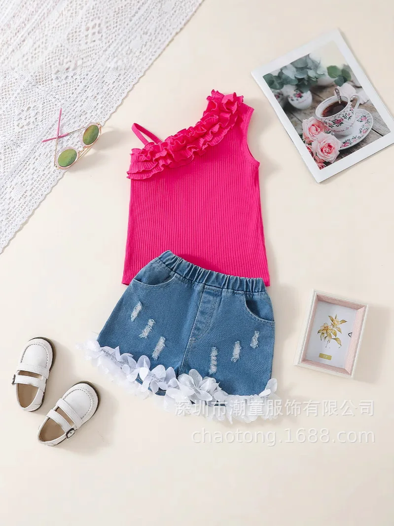 2026 Summer Casual Girls’ Two-Piece Set Cross-Border Hot Selling Children’s Wear Condole Lace Top with Lace Denim Shorts