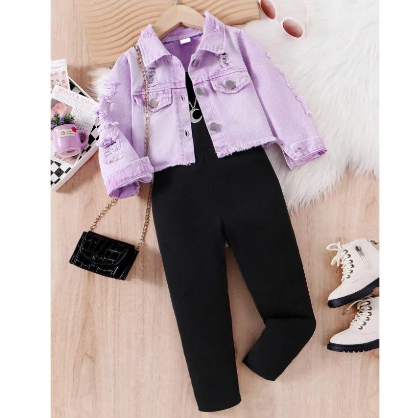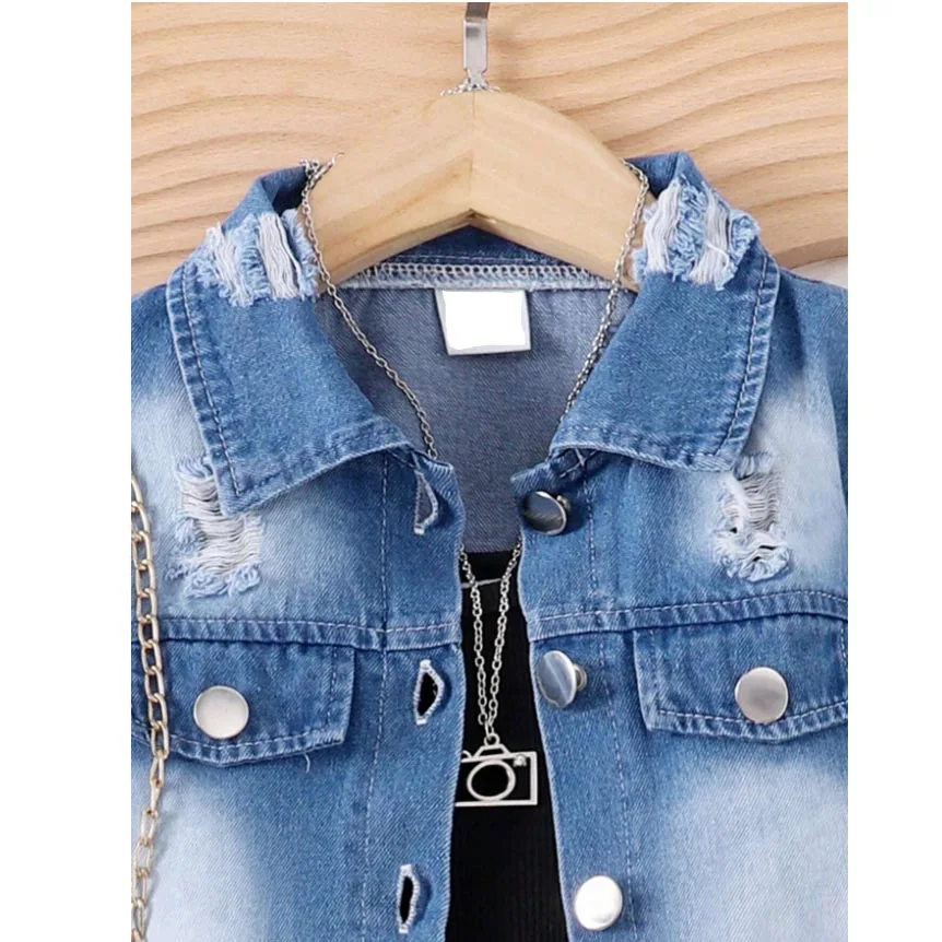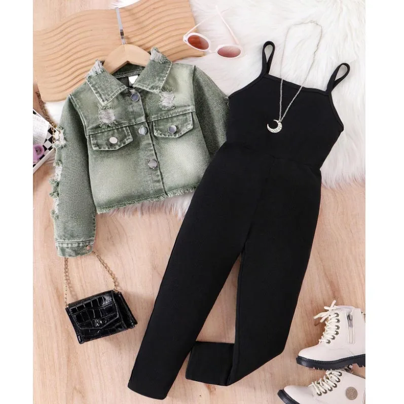 4-7T Clothes for Girls Ripped Cardigan Denim Jacket Suspender Jumpsuit 2Pcs Set Girls Casual Daily Outfit Children Clothing