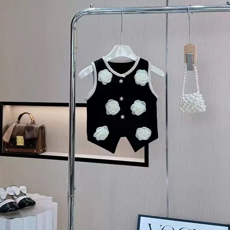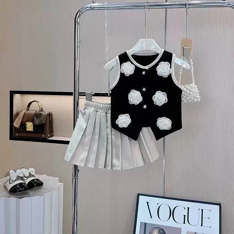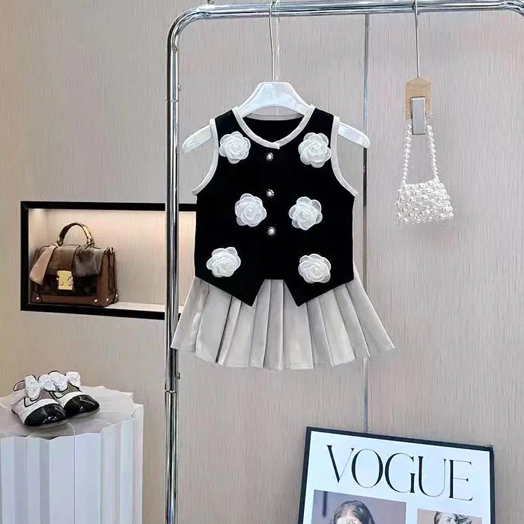 4-7T Kids Clothing Elegant Luxury 3D Flowers Sleeveless Cardigan Jacket Pleated Skirt 2Pc Girls Clothes Summer Kids Clothes 2026