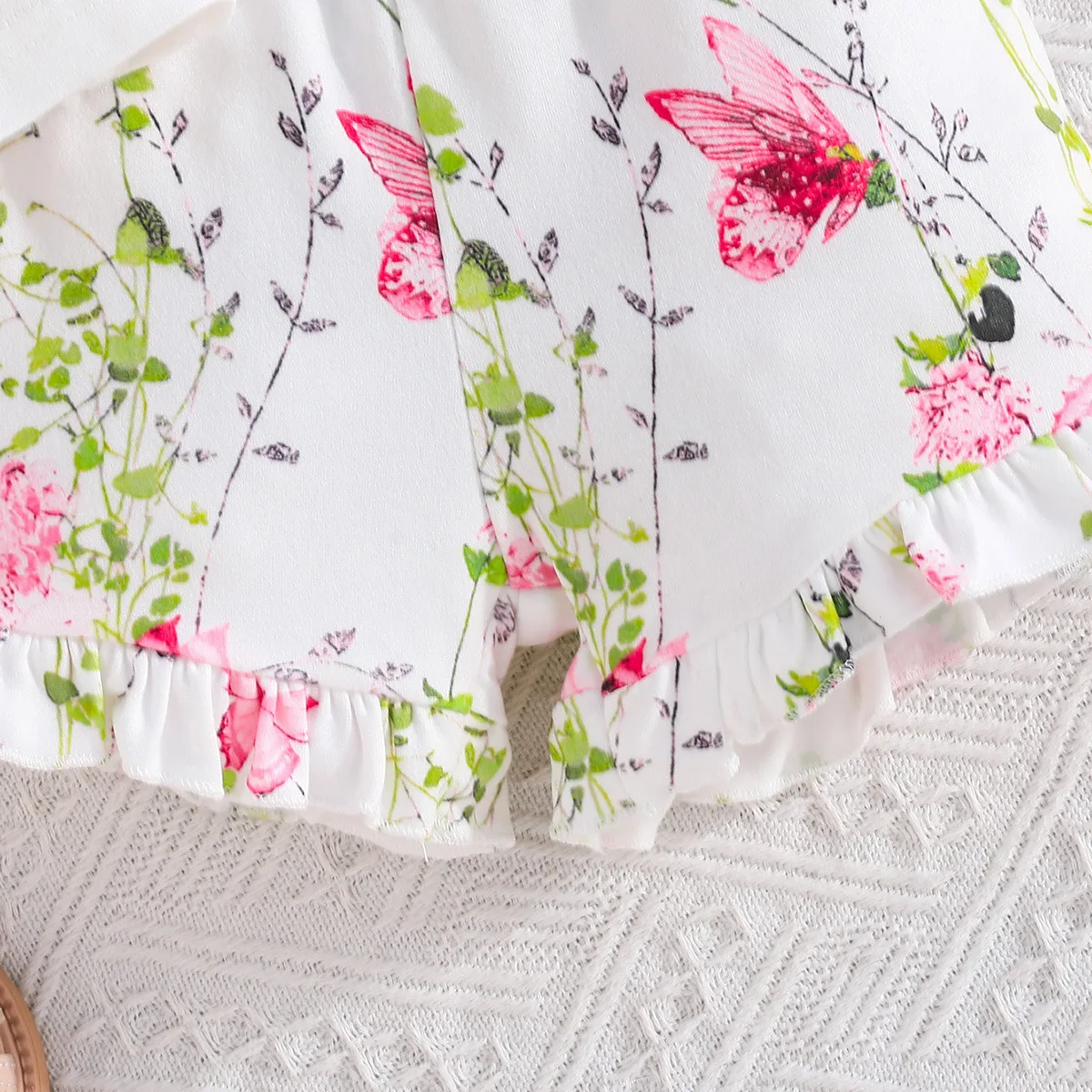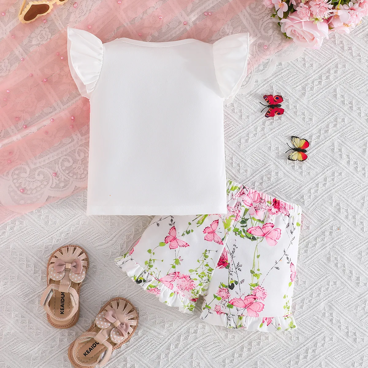 Baby Girl Summer Cool Sweet Butterfly Print Flying Sleeve Top Fresh Flower Shorts Set for Infants for Summer Season MOQ 2 Pieces