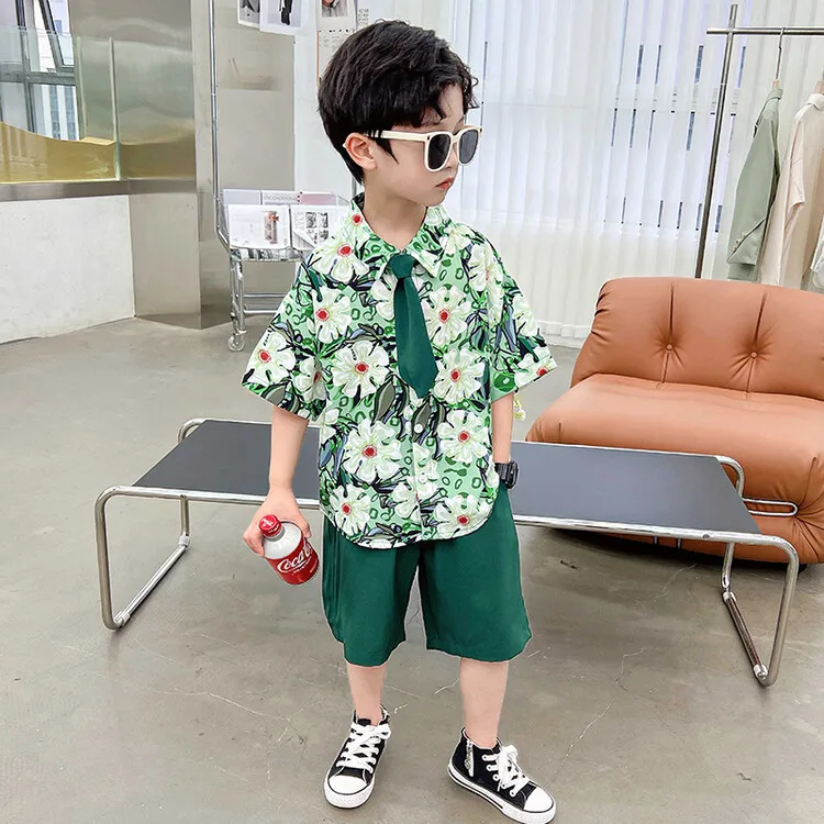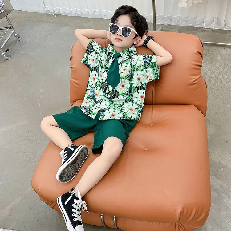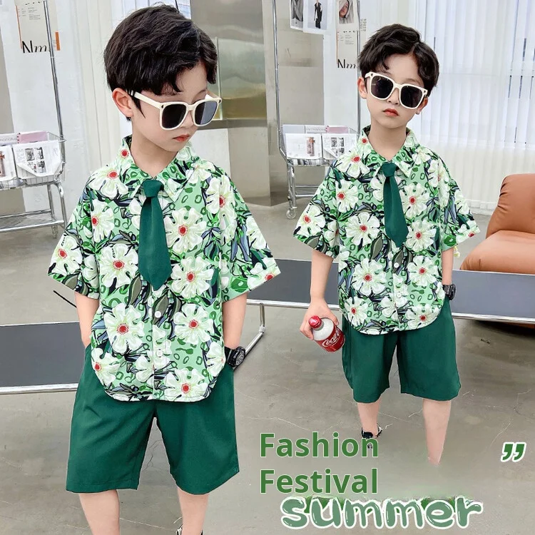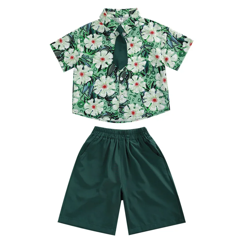 Boys’ Green Floral Shirt Set Summer New Children’s Short-sleeved Shirt June 1 Performance Clothing for Children