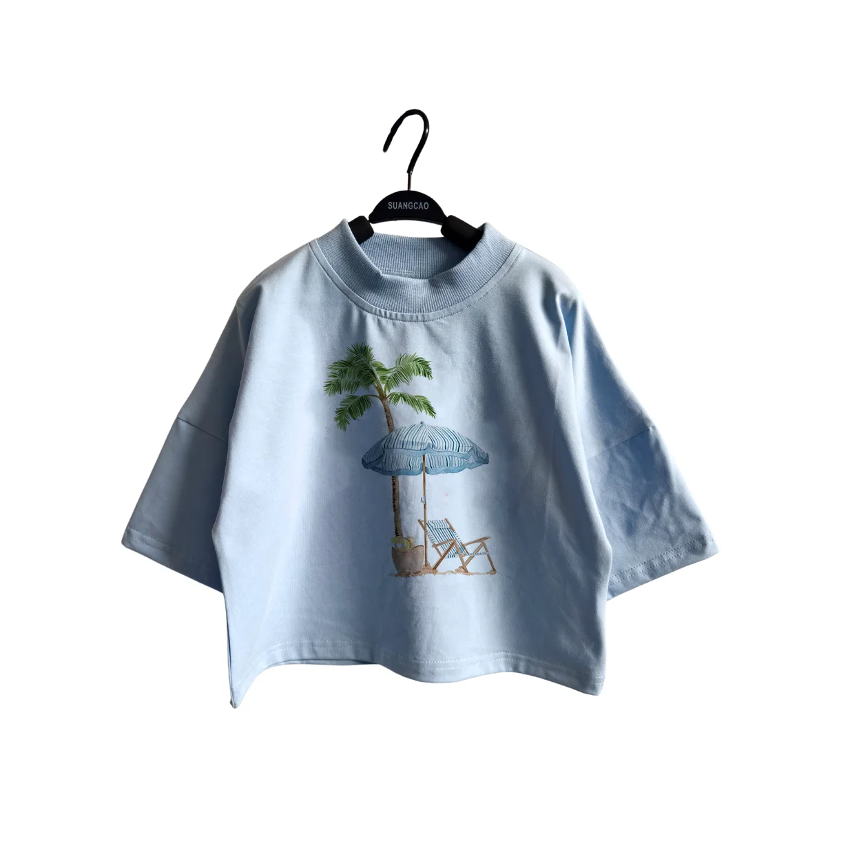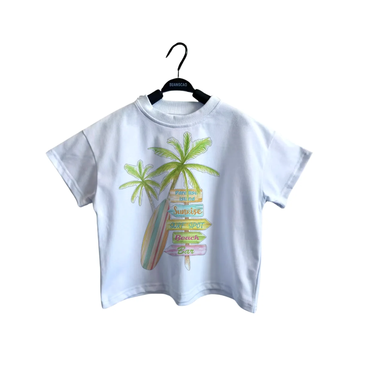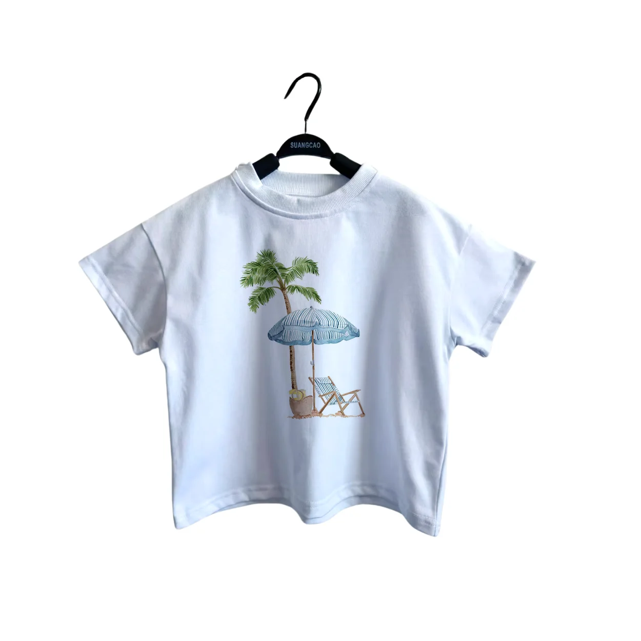 Custom Baby Kids Summer Beach Vibe Printing Oversized Tees Boys Girls Neutral Boxy O-neck T-shirts