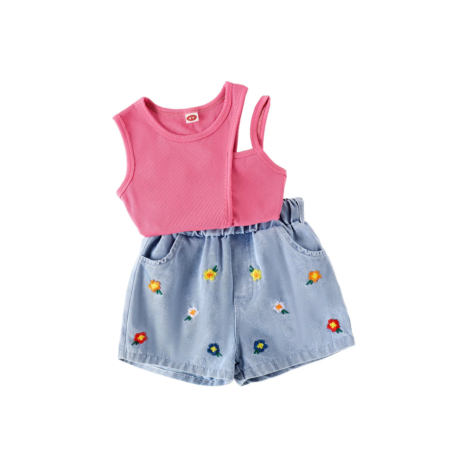 Factory Direct Sale Kids High Quality Set One Shoulder Solid Pit Strip Vest Floral Denim Shorts 2Pcs Boutique Girl Clothing