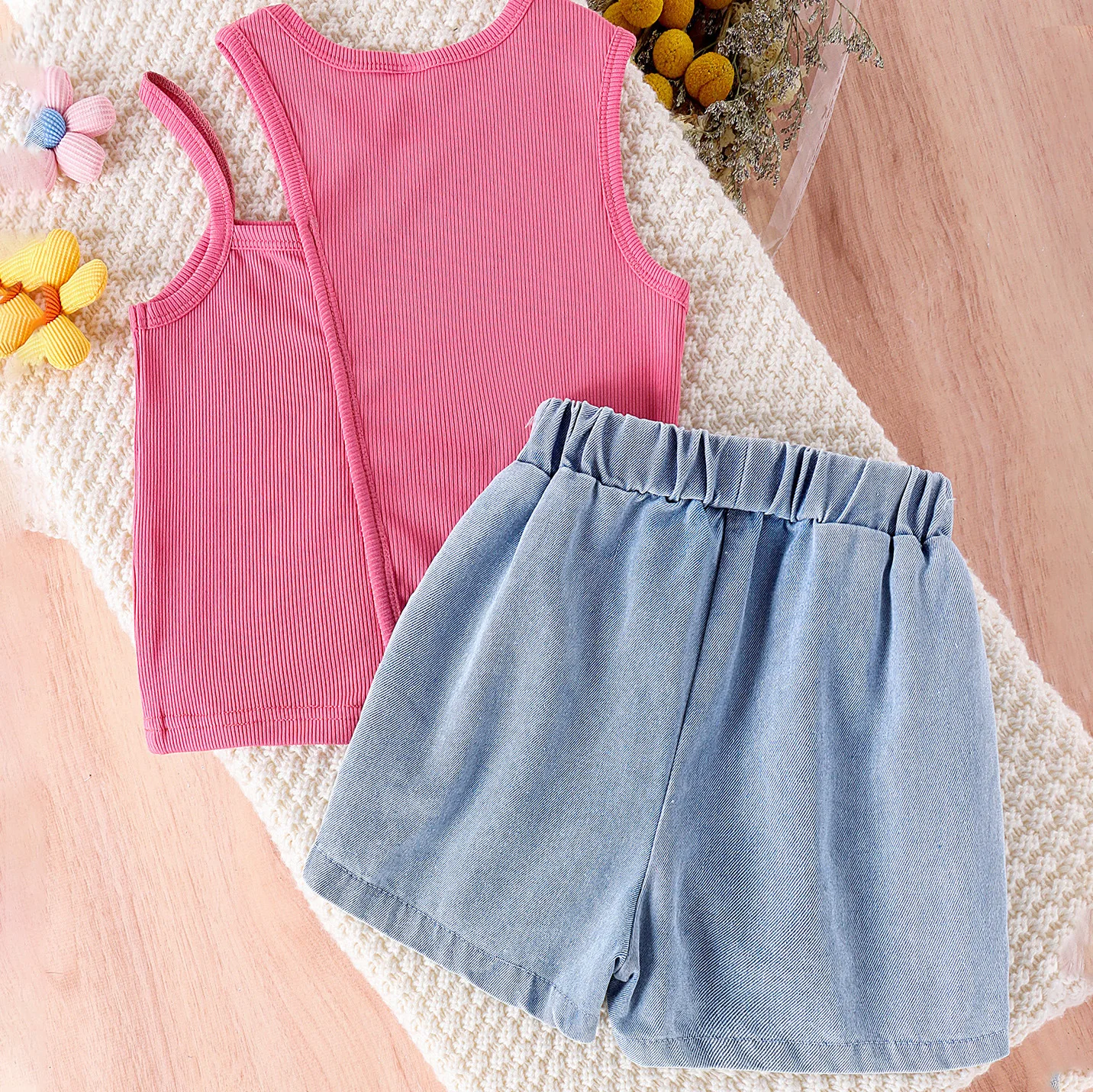 Be the first to review “Factory Direct Sale Kids High Quality Set One Shoulder Solid Pit Strip Vest Floral Denim Shorts 2Pcs Boutique Girl Clothing”