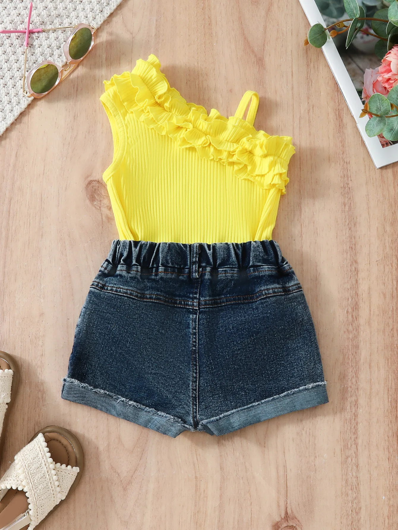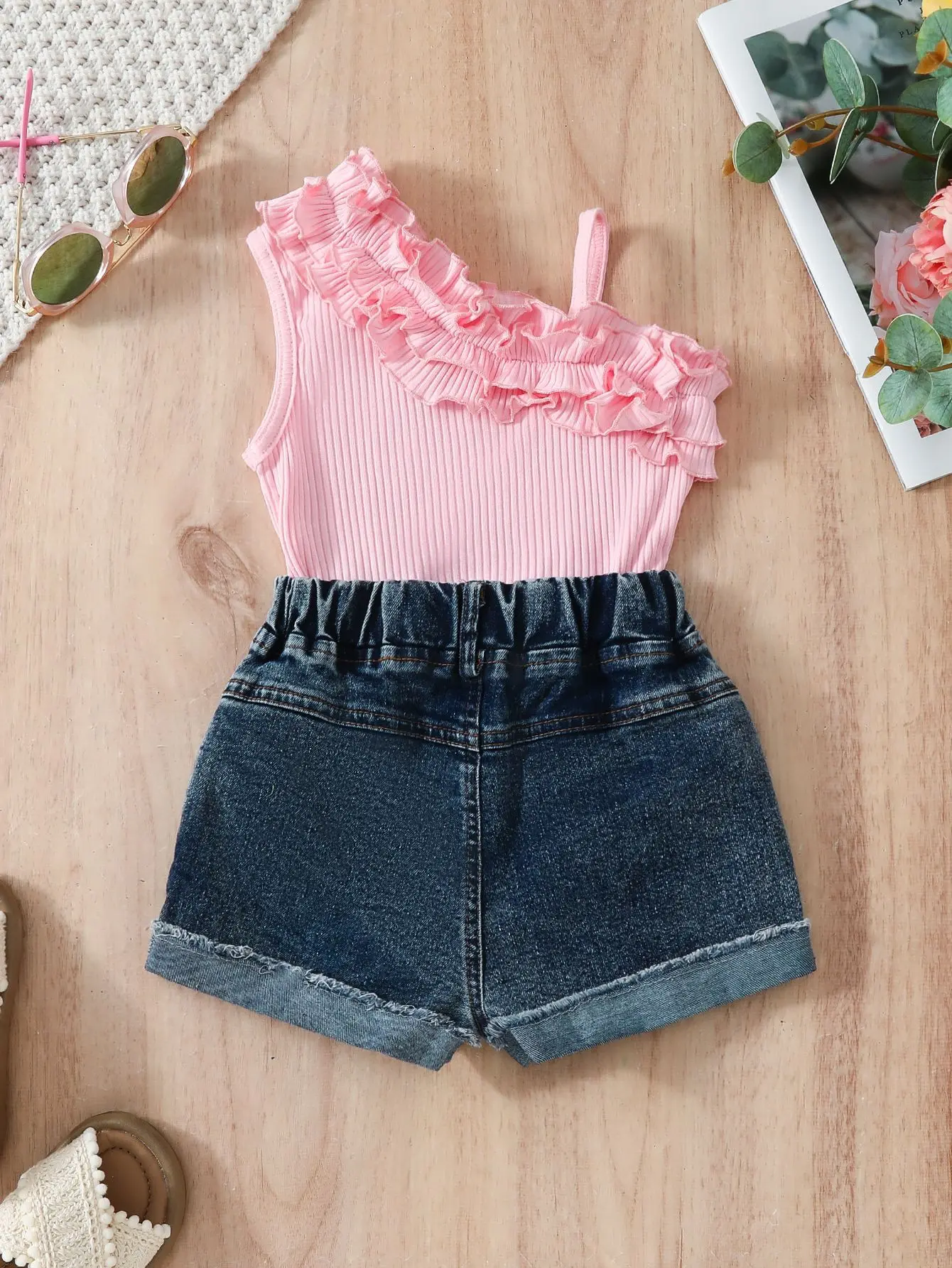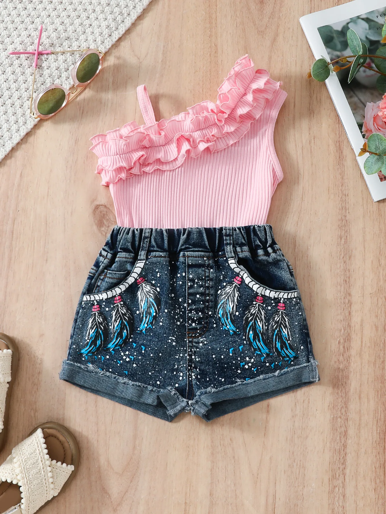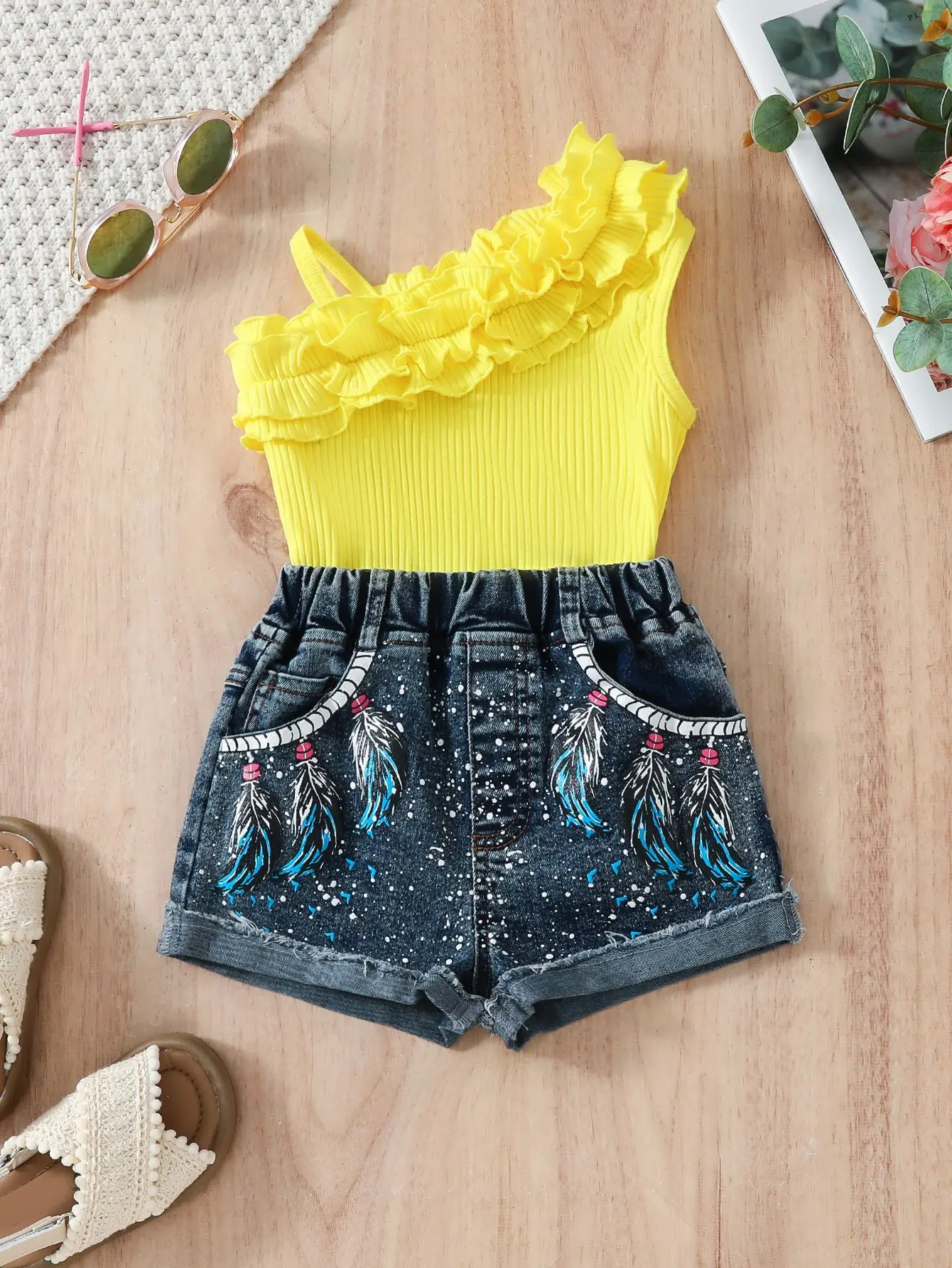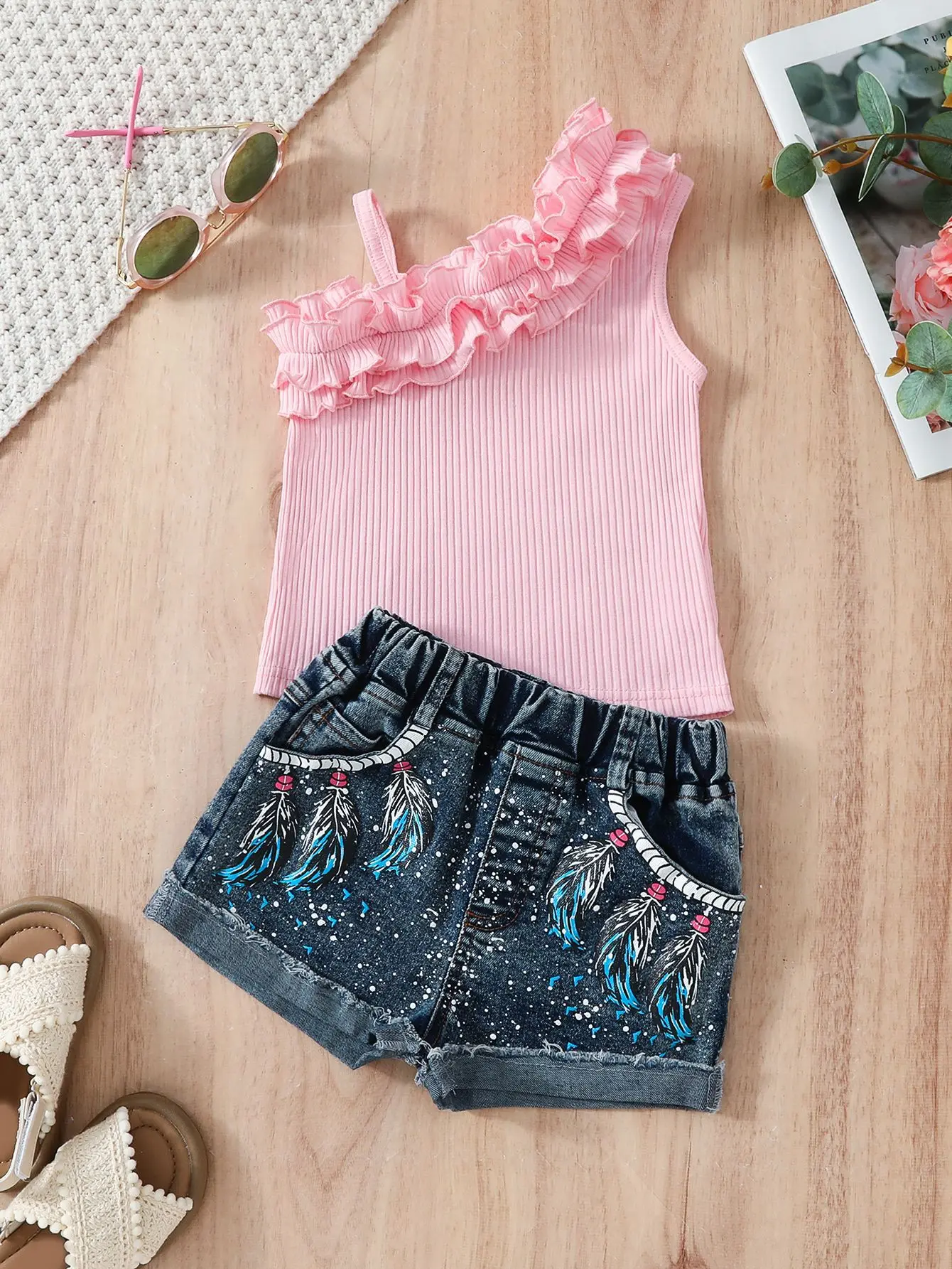 Girls 2026 Summer New Diagonal Shoulder Lace Suspender Top Printed Denim Shorts Set Casual Cotton Fabric Solid for Summer