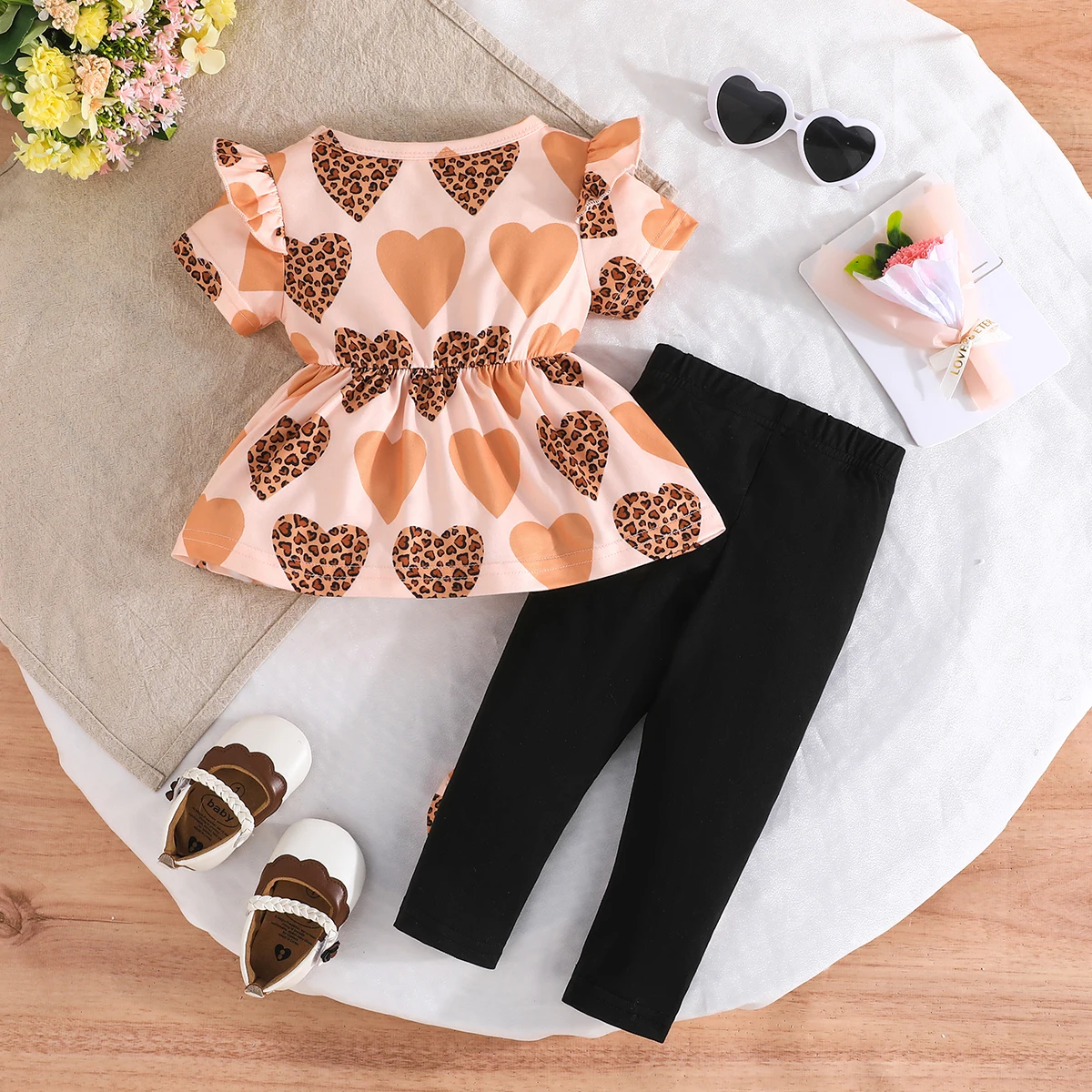 Girl’s Exquisite butterfly Bow Top with Flying Sleeves Paired with Little love Print Shorts, Multi Colored Fashion Two-piece Set