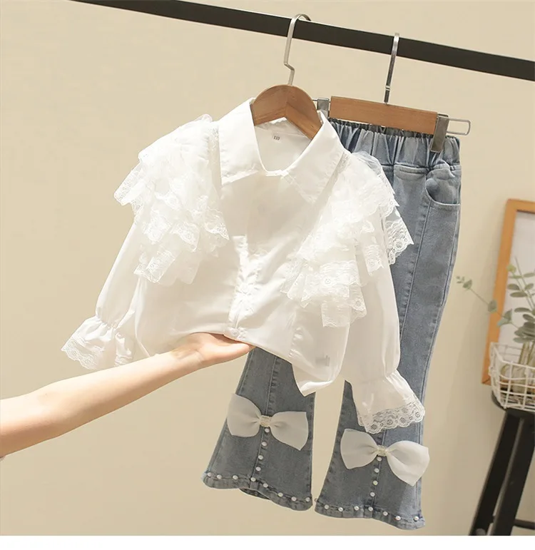 Girls Spring Autumn Children Clothing Lace Lapel Long Sleeved Shirt Bow Pearls Jeans Two Piece Sets Trending Kids Clothes
