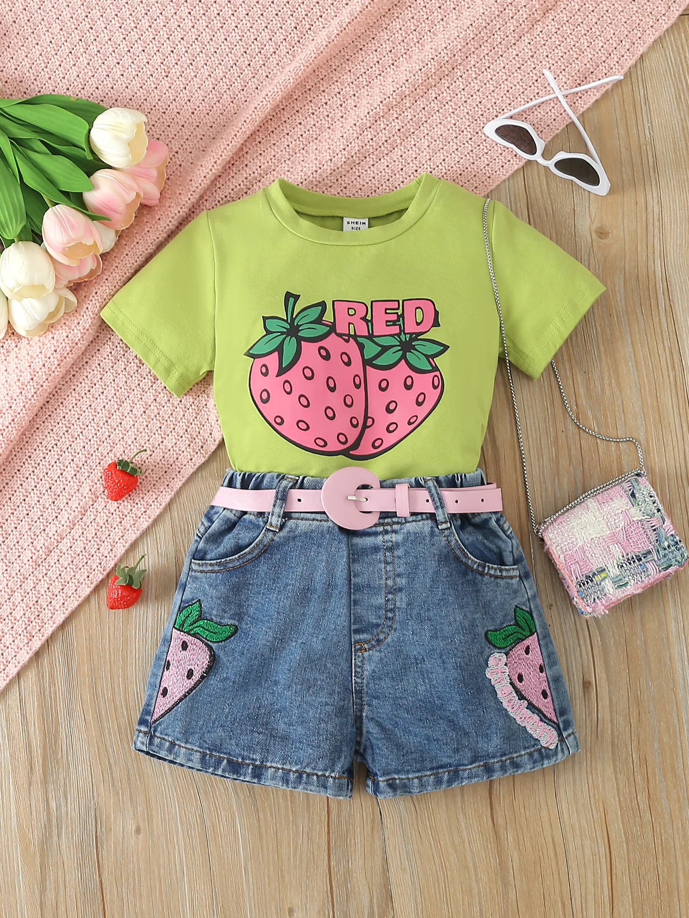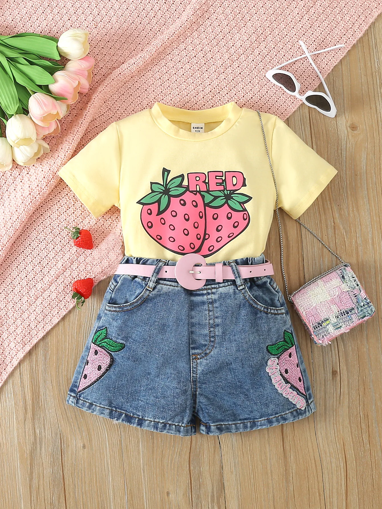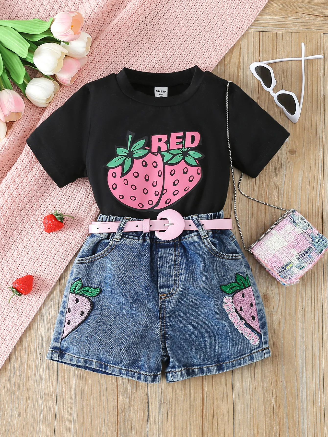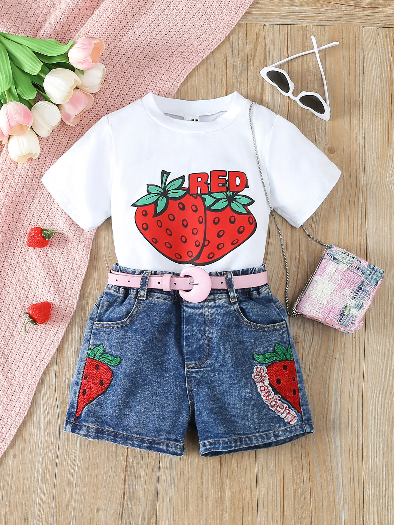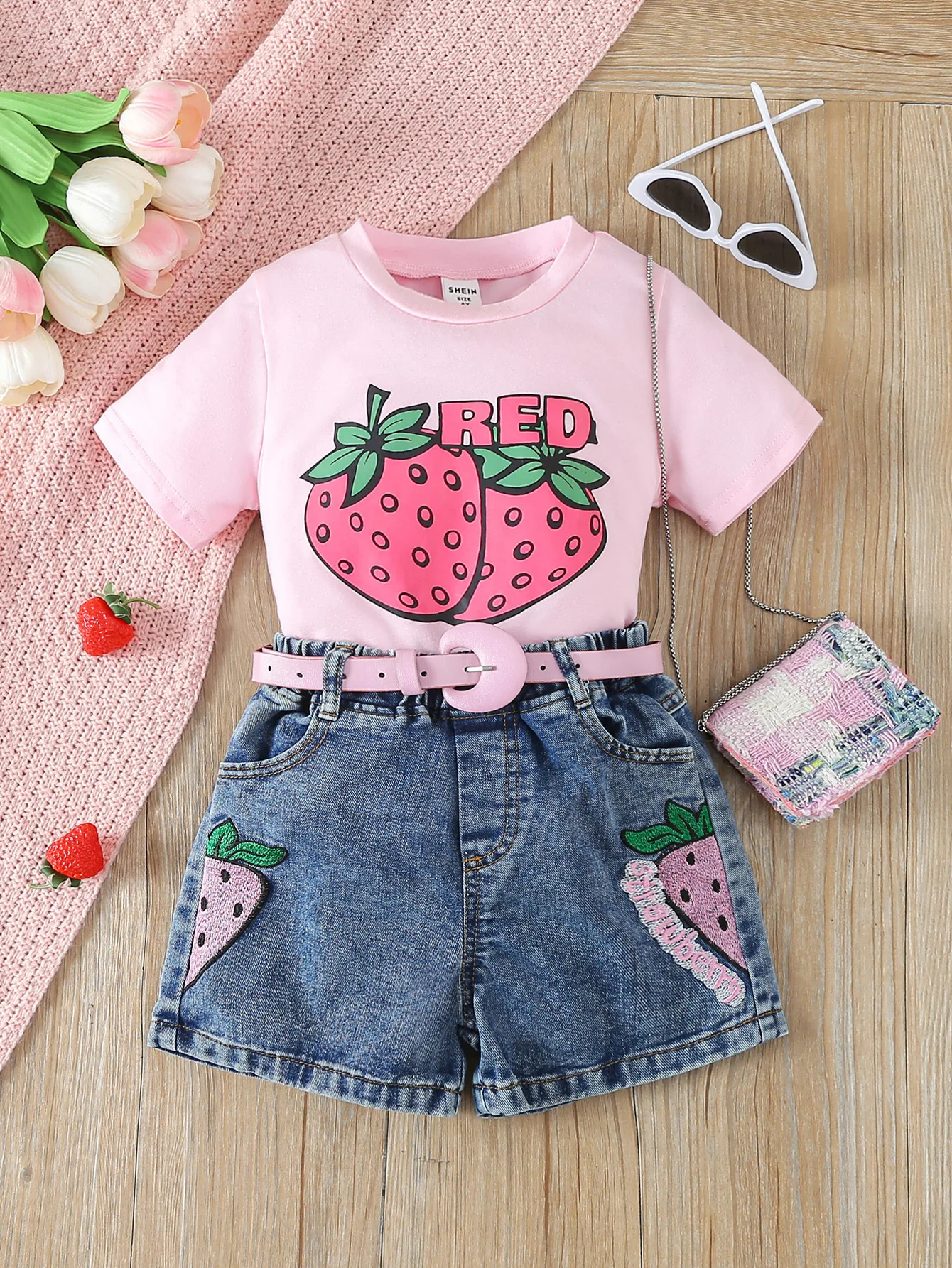 Girl’s Two-Piece Set Spring Summer Korean Short Sleeve Strawberry Printed T-Shirt Open Bag Embroidered Denim Shorts Cotton Belt