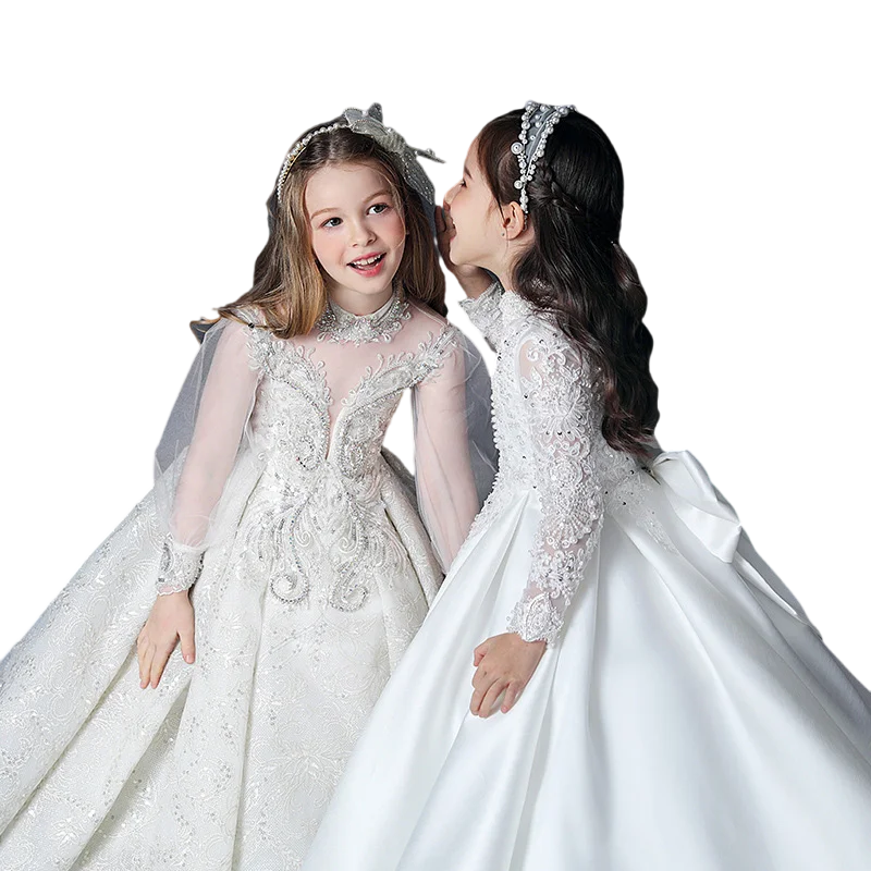 High Quality Embroidery Beaded Bow Kids Gowns Flower Girls Wedding Bridesmaid Dresses Communion Dress White Pageant Party Frock