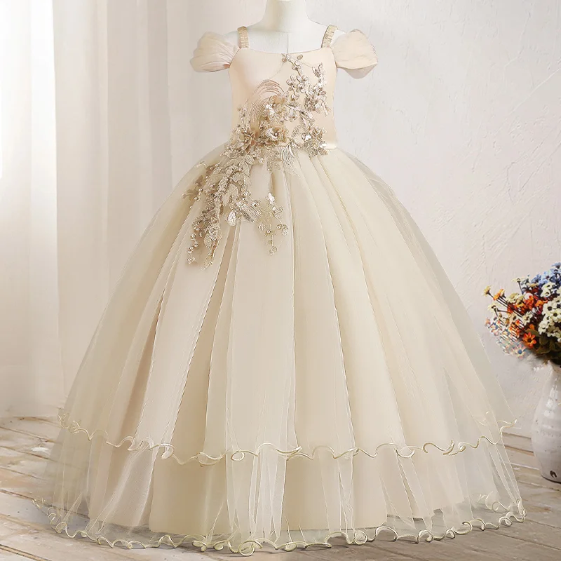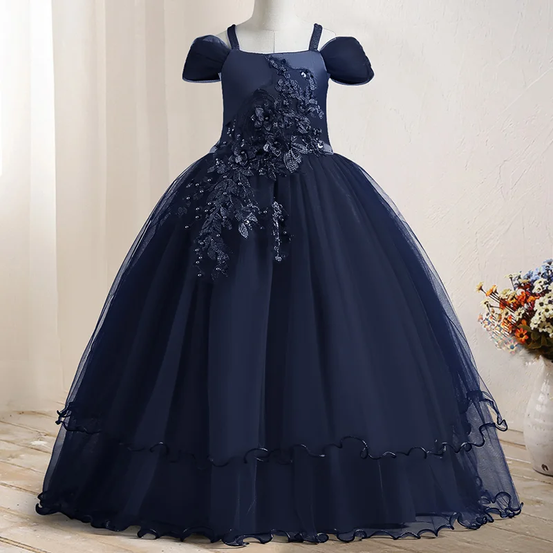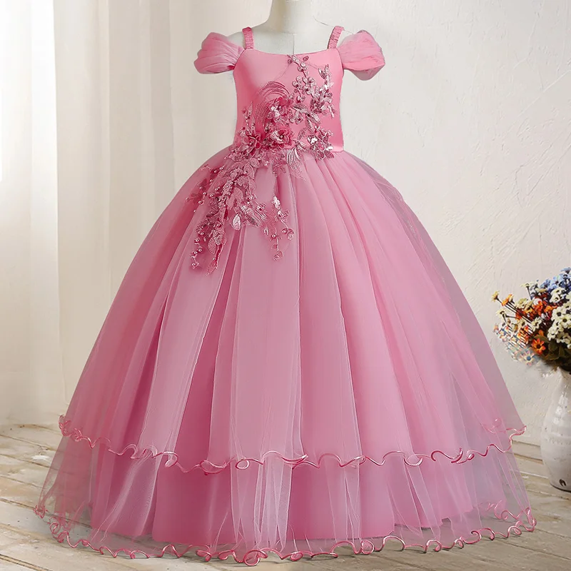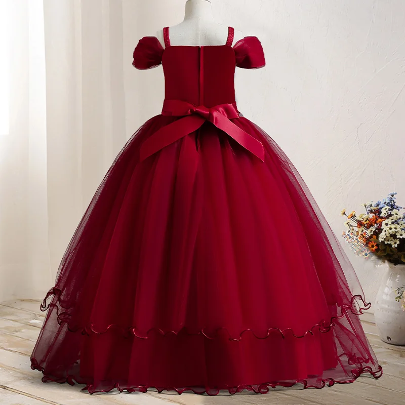 Hot Selling Kids Gown Girls Birthday Pageant Party Dress Solid Formal Vintage Embroidery Lace Off Shoulder Girls Princess Dress